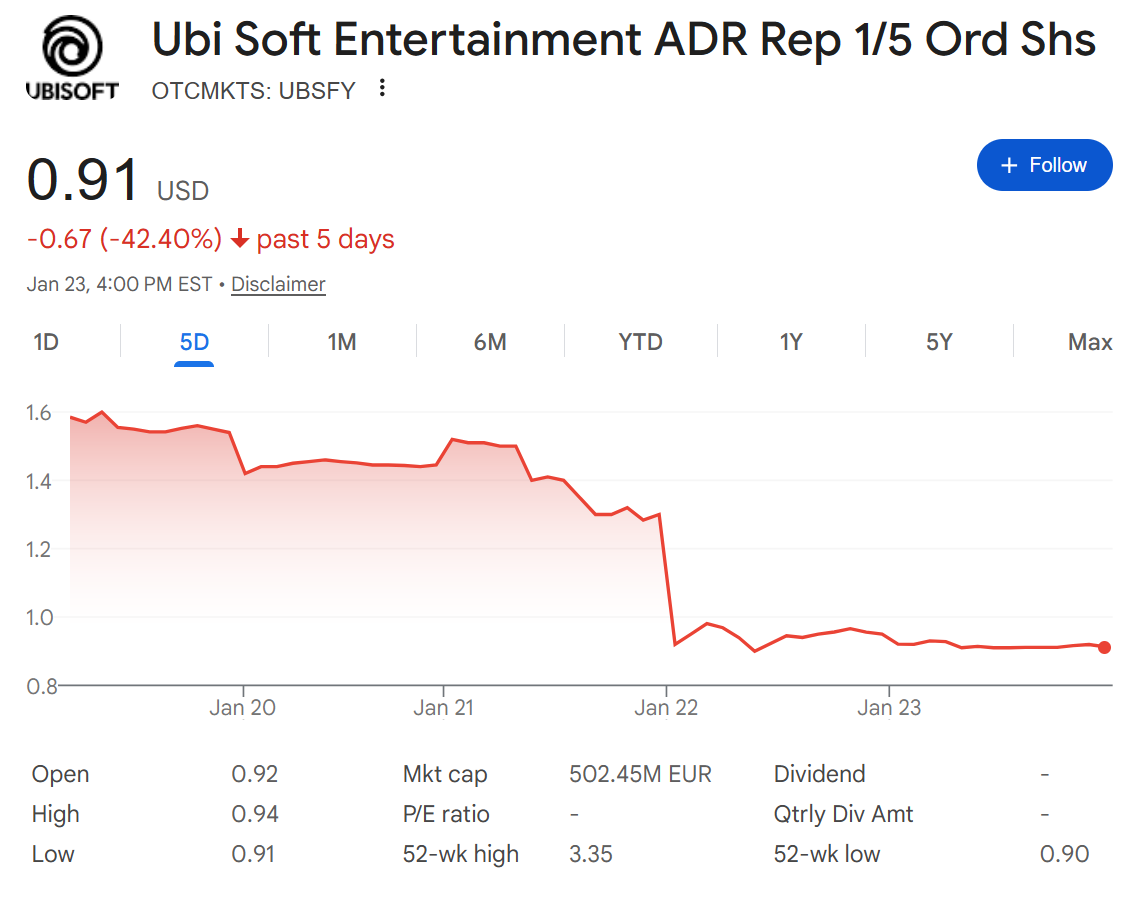 Эти слухи, подкреплённые экстренной приостановкой торгов акциями в ноябре и последующим объявлением об отмене шести игр, включая долгожданный ремейк Prince of Persia: The Sands of Time, привели к историческому обвалу. Акции компании на Парижской бирже рухнули на 35% за один день. Паникующие "финансовые акулы" и мелкие спекулянты стали выставлять акции на продажу, пока они совсем не обесценились. Гиймо и правление ждали, а когда цена акций достигла самого низкого уровня с 2012 года, они дали команду на радикальную операцию по спасению.