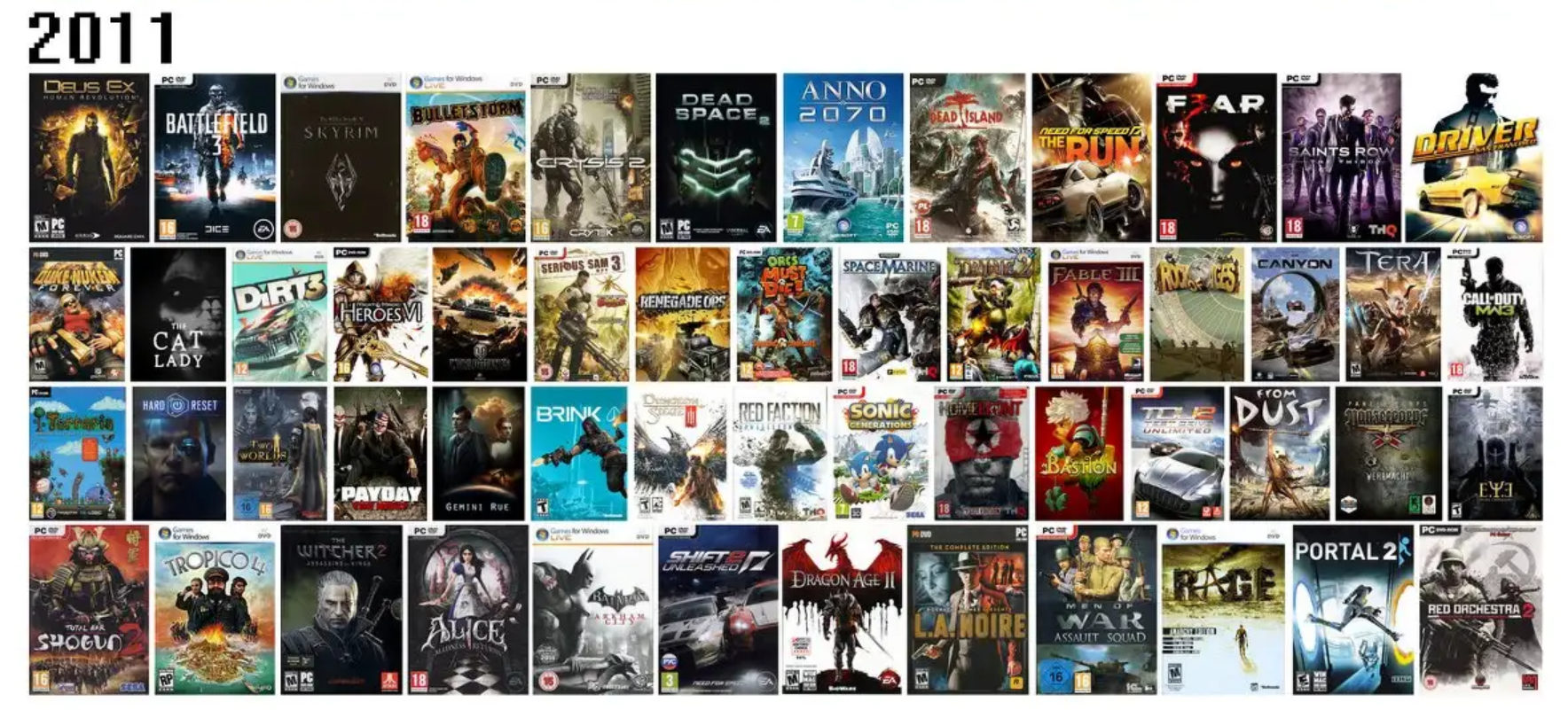 Самый лучший год для шутеров был 15 лет назад, тогда в один год вышли такие винчики, как: Killzone 3, Resistance 3, Bulletstorm, Duke Nukem Forever, Rage, Crysis 2, Battlefield 3, Dead Space 2, Serious Sam 3, Call of Duty: Modern Warfare 3.