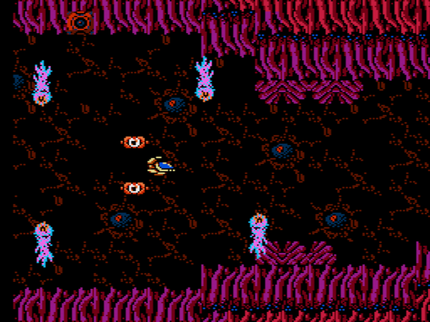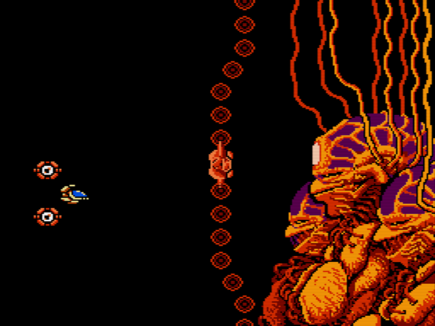 Во-вторых, у опшенов ("options" - шарики, которые летают возле твоего корабля и стреляют, если кто не понимает о чем речь) есть две разные формации, которые можно в любой момент переключать. Постоянно переключаешь с широкой "АОЕ" формации на более узкую - для сингл-таргета. Более того, в главном меню ты можешь поменять расположение этих самых шариков как тебе угодно, а потом зайти и затестить в тестовом режиме. Где-нибудь такое было вообще? 1991 год нахуй! А, оружие кстати тоже можно кастомизировать. Можно сделать чтоб лазер стрелял прямо или автонаводился. Или чтобы половина выстрелов летело прямо, а половина автонаводилась, причем порядок и соотношение тоже выбираешь сам. К примеру: первые 3 выстрела будут лететь прямо, 4й автонаводиться на ближайшую цель, а 5й снова прямо. Тоже чето невиданое для игры с НЕС, я хз.