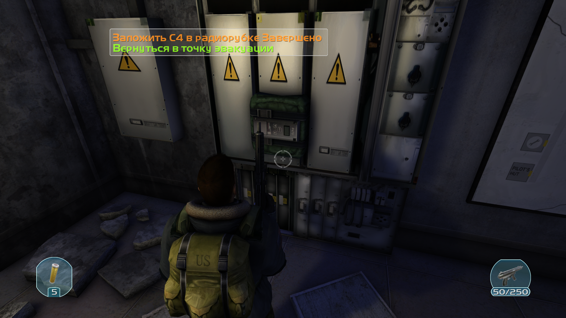 Чуть дальше лабораторного отсека мы наткнулись на разбитый вертолет. Судя по всему тот, что присылал припасы на эту базу. При каких обстоятельствах был сбит неизвестно. Рядом с ним нетронутые C4 боезапасы. Вдоль от вертолёта в разрушенном из домов находился второй найденный мертвый человек. Судя по всему замерз насмерть. Был отдан приказ сверху использовать найденные C4, чтоб заминировать остатки базы. Выдвигаемся.