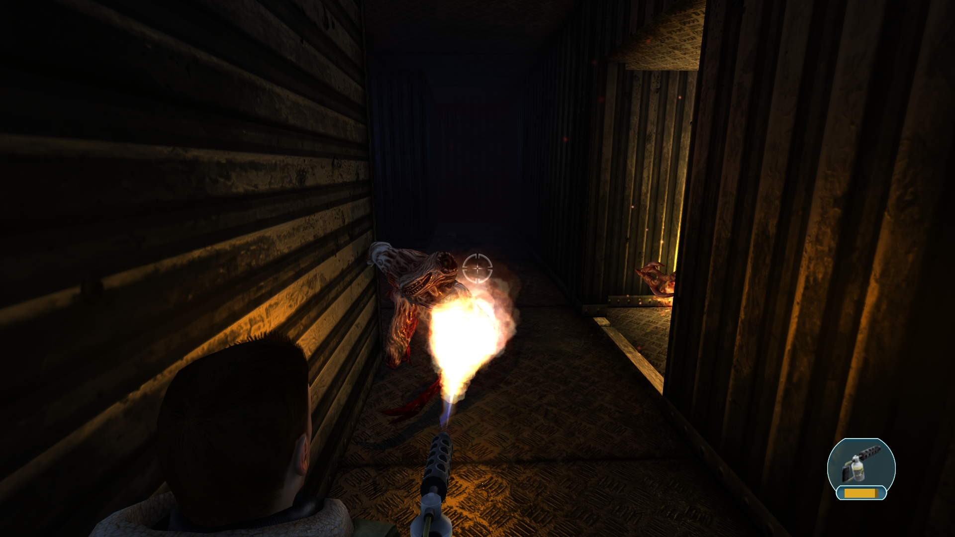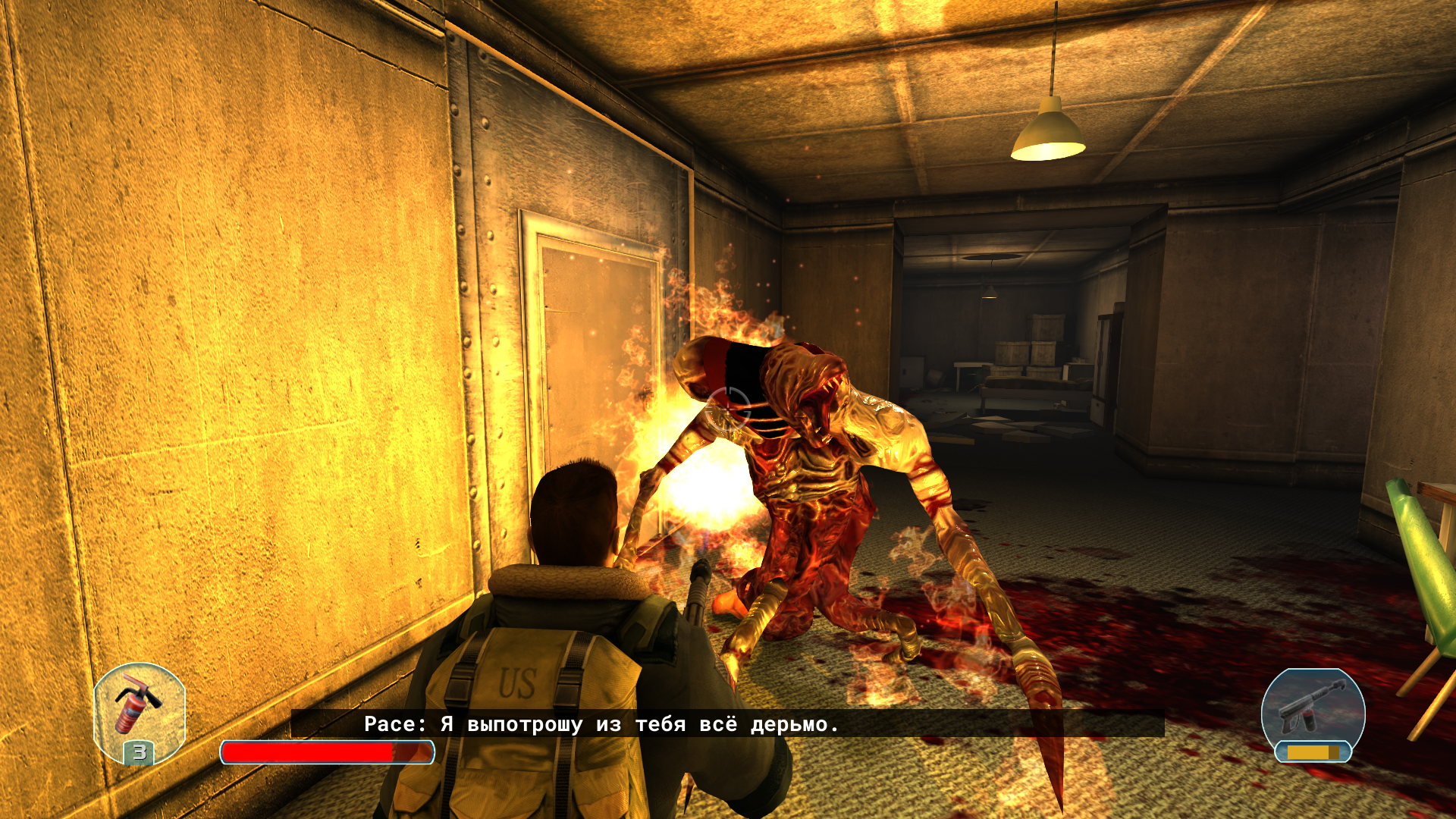 Начал ебашить огнеметом. Их там оказалось несколько. Слишком узкое пространство. Я решил принять рисковое решение и выстрелить по бочкам бензиновым, волной удара меня нахуй выкинуло с дверью наружу, а нечисть сгорела заживо внутри. Чудом уцелел.
