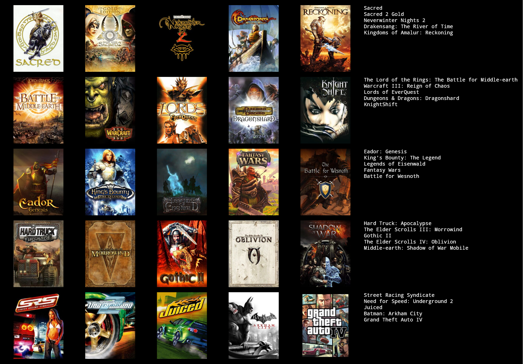 Little Big Adventure 2: Twinsen's Odyssey (можешь начать с первой части, но вторая намного лучше во всем), The Tone Rebellion, Discworld Noir, Sid & Al: The Incredible Toons и вся серия The Incredible Machine (но она довольно известная), One Must Fall 2097 и One Must Fall: Battlegrounds (не люблю файтинги, но тут интересно сделали, а музыка вообще шикарная), Jazz Jackrabbit 1-2, Времена Раздора (скоро должен вроде как выйти ремейк) и Легенды Эйзенвальда, Вангеры, Theme Hospital, Warlords 3 с дополнением Darklords Rising (у нынешних зумеров вся серия неизвестная, полагаю), X-Men Legends II: Rise of Apocalypse, Second Sight (ненавижу шутаны, но этот понравился, даже несмотря на откровенную клюкву), Недетские Сказки, Sakura Wars 1 и 2 в позорной лоКАЛизации кАкелы (хотя вторая ничего, да), Super Solvers: Challenge of the Ancient Empires, Deathtrack, C-Dogs, Epic Pinball и Extreme Pinball (музыка там божественная), Jets'n'Guns Gold (ненавижу шмапы, но этот мне понравился, и музыка- огонь), Gobliiins 5 (кто вообще в курсе, что она вышла, хотя вторая и третья- все равно лучшие части довольно известной серии), Stacking (МАТРЕШКИ!!!), The Sexy Brutale, Tale of Wuxia и Tale of Wuxia: The Pre-Sequel (но перевод на ангельский у обеих дерьмовый), The Last Remnant (для меня лучше всех финалок вместе взятых) и Resonance of Fate.