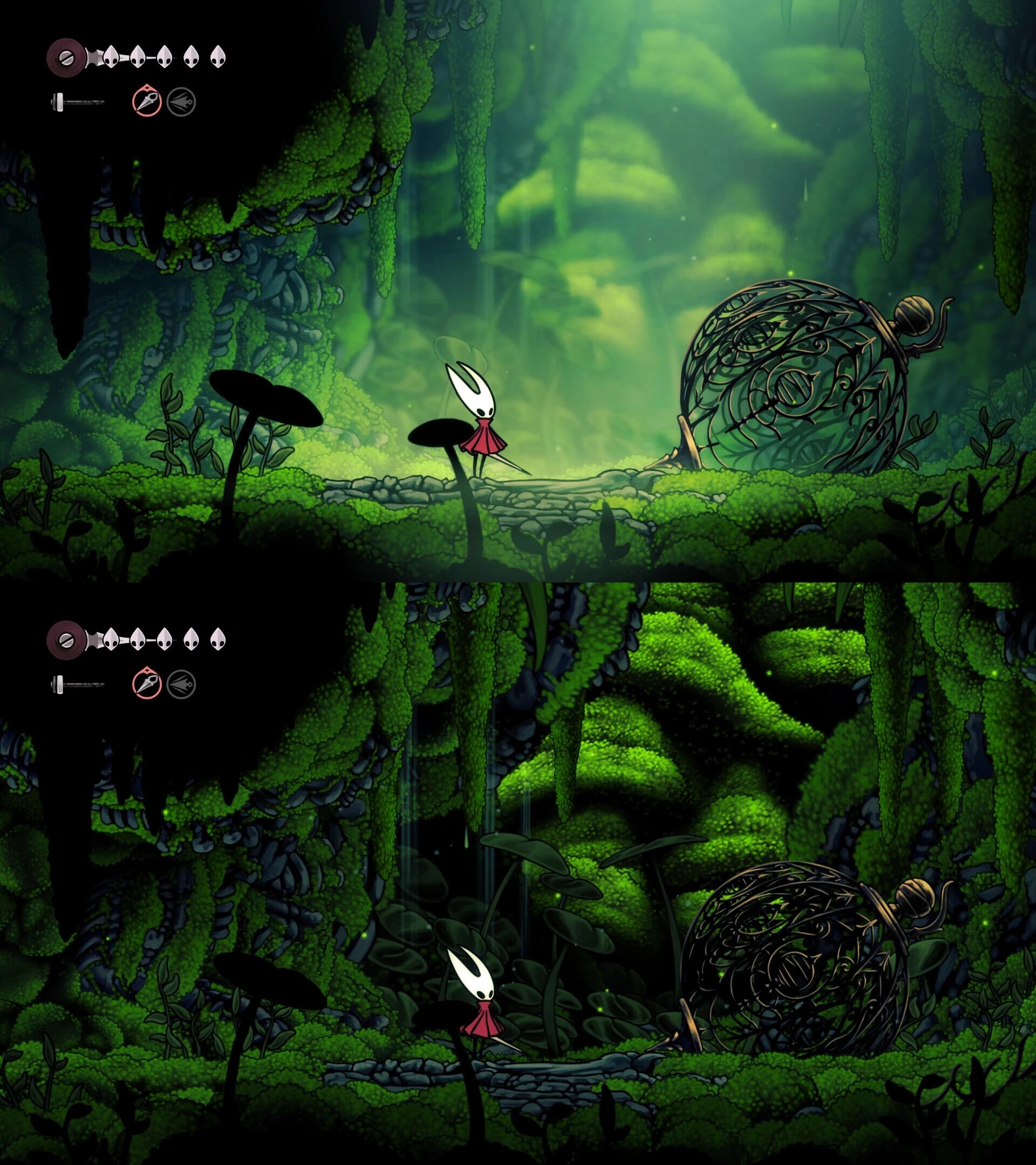 Ну изначально исходный "мыльный" вариант задизайнен со вполне разумной целью визуально разделить статичный бэкграунд сцены и динамичные объекты (игрока и врагов); если в моде принудительно отключить вообще весь туман и размытие, в локациях типа того же Мохового грота, Полей и Цитадели становится тупо некомфортно играть в динамике, особенно в секциях со спавном нескольких волн врагов за раз, т.к. на слишком пёстром фоне анимации хуже различимы.