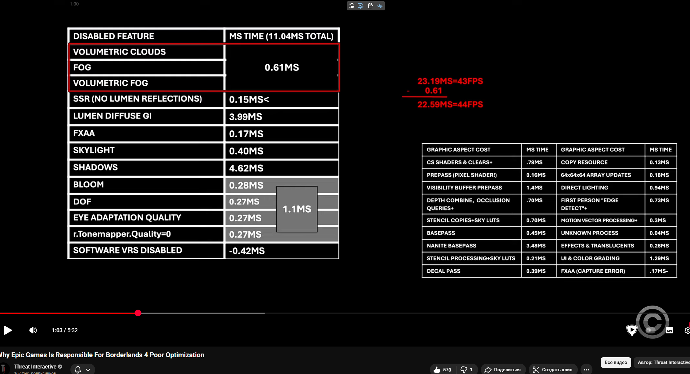 >Ещё один момент: я играю с отключённым объёмным туманом. Отчего производительность повышается. Я лично считаю, что объёмный туман не настолько хорош, чтобы его включать. Некоторые ребята в команде считают, что он очень важен для визуального восприятия и используется в нескольких сценах, но, как по мне, это не стоит таких жертв. Рэнди Питчфорд глава гирбокс и Borderlands