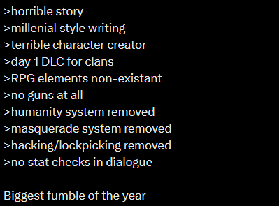 При этом у игры реально достойный сторителлинг, мне он наверное больше чем у 1-й зашел, есть ощущение что ты в вампир сосаети и все вокруг пидорасы со своими скелетами, крутая атмосфера, моменты с Фабиеном мне тоже зашли, но все это просто уходит в помойку от всратого окончания, даже как чисто сюжетная игра она в итоге не вывозит. Но какую-то долю кайфа можно получить, ибо альтернатив про вампиров сегодня в целом нет. Вспомню только кусок говна под названием Vampyr который я дропнул спустя минут 20 устав от нытья гг про "пок пок я стал чудовищем как теперь жить" он даже попытался покончить с собой