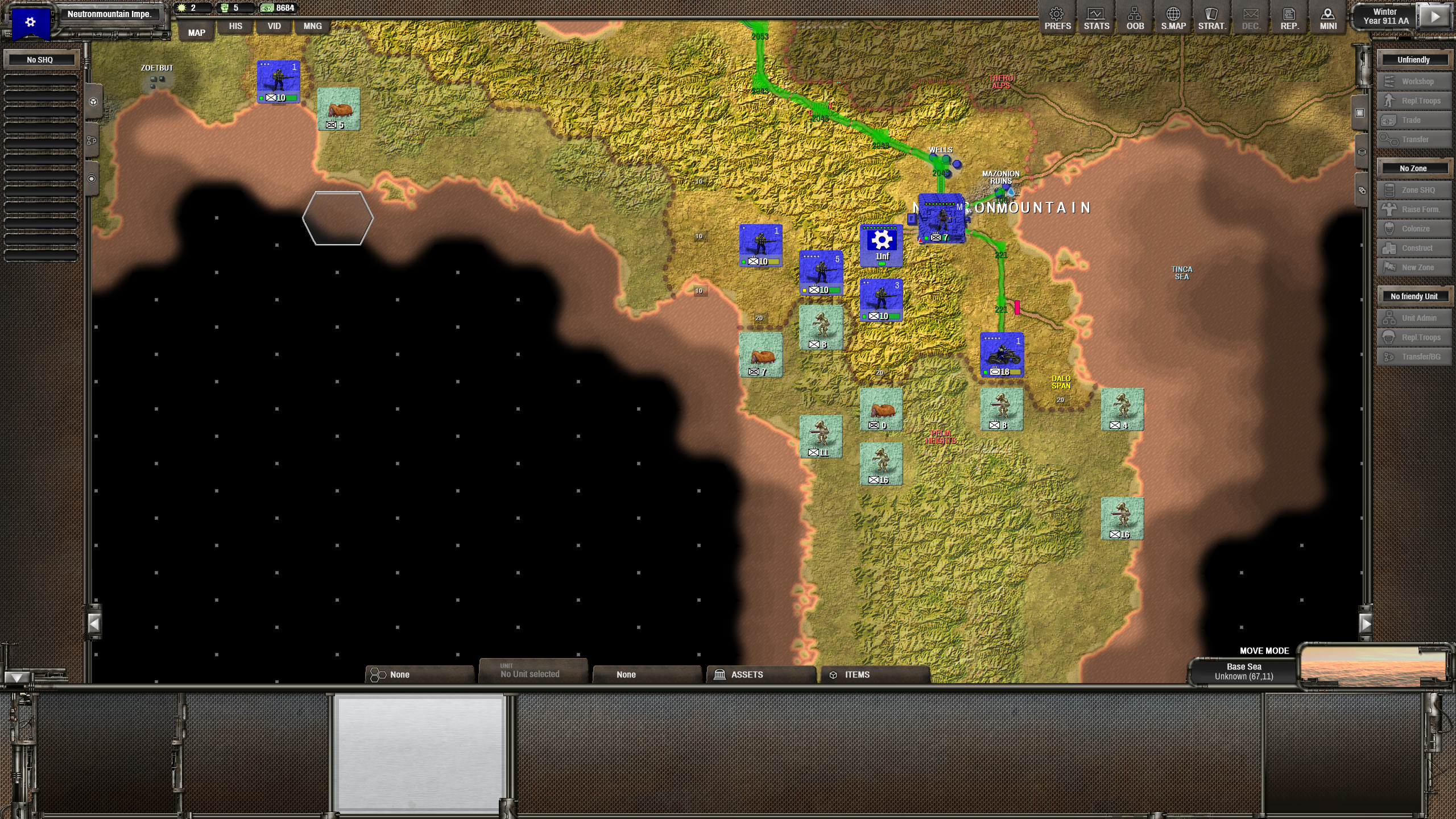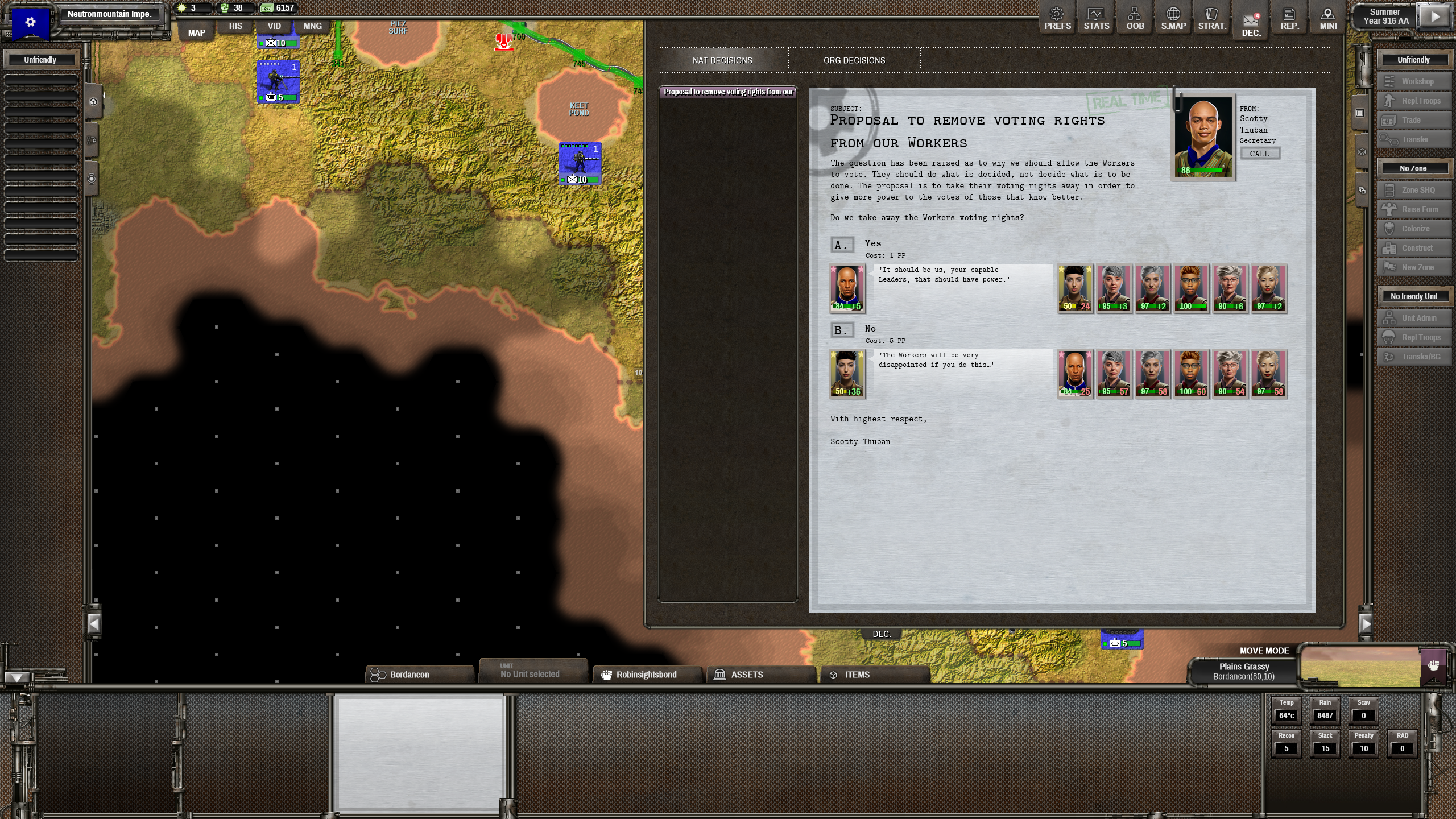 Началась вторая рептилоидная война. Далеко на юге есть аж целая одна клетка руин, из которых можно залутать хоть какие-то ресурсы. Это, конечно, мелочи, но куда больше, чем нихуя вообще. Заодно нужен хотя бы один вулкан, чтобы добывать из него энергию - энергоносителей-то у нас тоже нет. Ради такого случая парадная танковая группа выехала деблокировать южную дорога (потратив половину бюджета страны), пока на западе пехота рубится с ксеносами за каждый аул. Параллельно решили отрицательно добавить рабочим возможность голосовать, которую установили прошлые министры. Но они были либерахами, так что пришлось их разогнать. Одна либераха спалилась своим недовольством уже на этом референдуме, за что была отправлена в почетную отставку. Теперь все нормально: земли худо-бедно отвоевываются, никто не бунтуют, народ любит своего лидера, а мигранты прибывают целыми городами, потому что на фоне войн восточных государств их стандарты жизни упали даже ниже моих. Теперь мой прирост населения - на 90% миграция, плодиться в этих горных ебенях в единственном городе очень непросто.