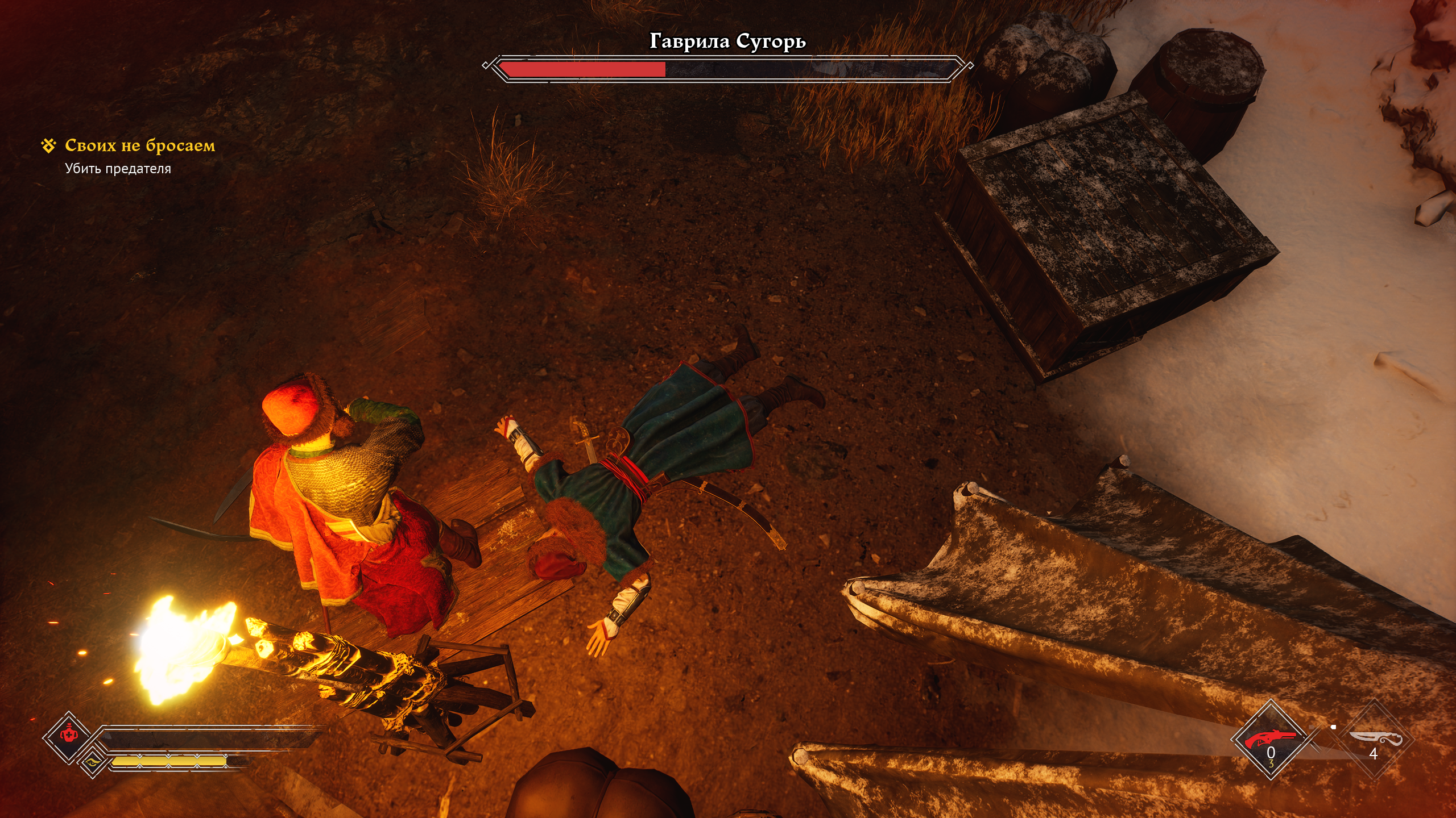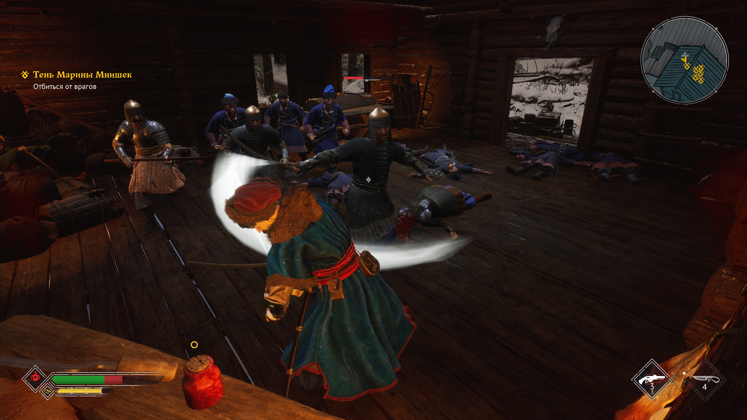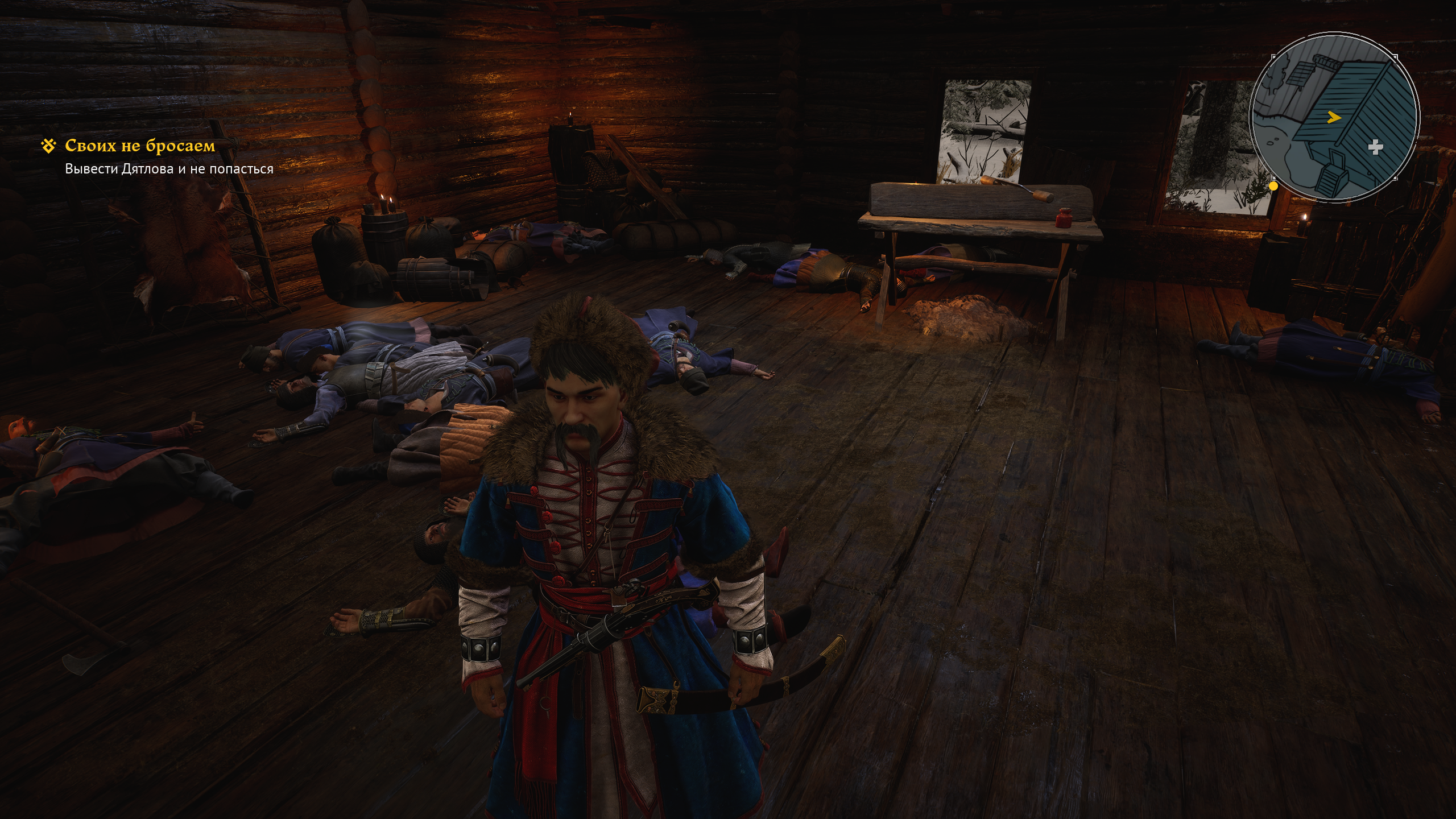 Зря я выше посмеялся из-за сравнения с соулзами, тут реально пиздец, я уже час траю, натурально ИЗБА-ЕБАЛЬНЯ. Тут минимум три волны по 5-6 человек, наружу выйти нельзя - расстреляют, в саму избу тоже стреляют и окон стоять нельзя. Из плюсов - аж две хилки, и Макар Саныч раз в 20 секунд протягивает заряженный пистоль, до которого еще надо добежать успеть.