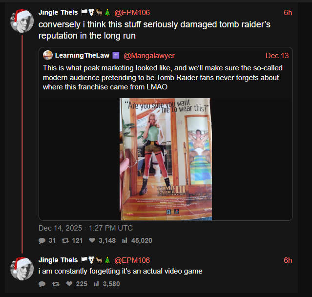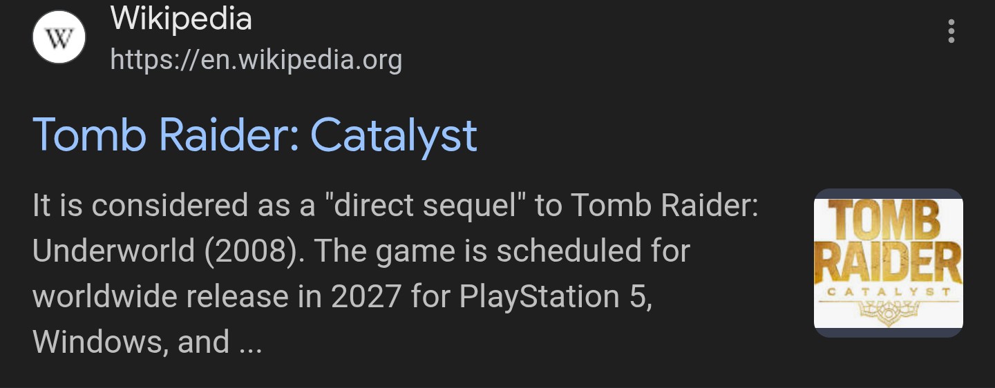 Кстати прикол еще в том что Лара Крофт это по сути персонаж на все времена. В отличие от Индианы и Дрейка: >Лара Крофт не ограничена 1930-1940 годами >Не стареет, не выходит замуж >в сюжетках есть всегда сверхъестественная НЕХ которая при этом не превращает игру в полное фентези Короче есть объективные причины по которым и Индиана и анчертед обосрались и загнали сами себя в яму. Чрезмерное развитие персонажей, дохуя правил и ограничения по сеттингу. Типа Индиана Джонс без нацистов это не Индиана Джонс, Дрейк без «реализма» и приземленности с посиделками дома и мытьем посуды это не Дрейк. Надо было сразу делать персонажей комиксов а теперь без ребута те обе франшизы мертвы а Лару Крофт можно хоть в космос отправить в будущем и всем зайдет