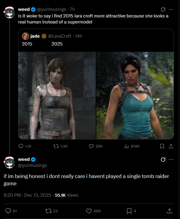 >>9981194 (OP) Ларка из перезапуска лучше. Она живая. А это чисто бимбо унитаз, как раньше. Но раньше это было норм, потому что полигонов было мало. Мне не понравилось.