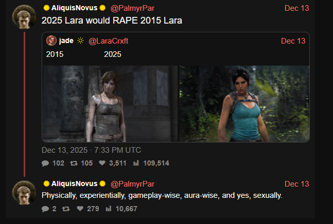 >>9987522 База. Вся суть перезапуска тр была в том что лару можно унижать и мучить, она постоянно растерянная, напуганная, перемазанная в кале и крови, она из раза в раз умирает сотнями натуралистичными способами и тд. Очень сомневаюсь, что солнечная и яркая эстетика анонсированных частей подходит под вот такое. А мне это больше всего нравилось в серии...