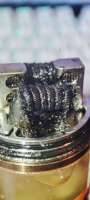 как я только не крутил, все равно вата горит, и на фотке видно что все с проточками норм, жидкость попадает, но сука горит все равно, я не знаю блять, 3, 4, 5 витков, 2мм, 2.5мм, мало ваты много ваты, средне ваты, все равно горит. На моде выставлен sp mode, 10w на всех койлах. жидкость любая.