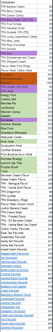 Глянул, кстати, забугорные рецепты на alltheflawors - все уже мешают не то что на FLV, VT, FA, RF, JF, PUR, а в принципе на аромках, которые к нам никогда не поставлялись и видимо не будут.