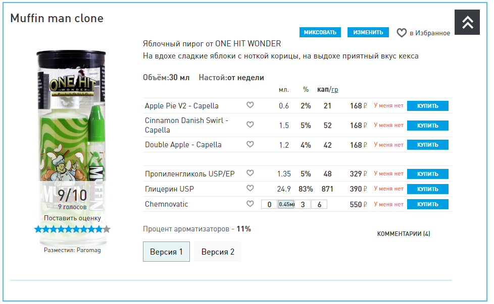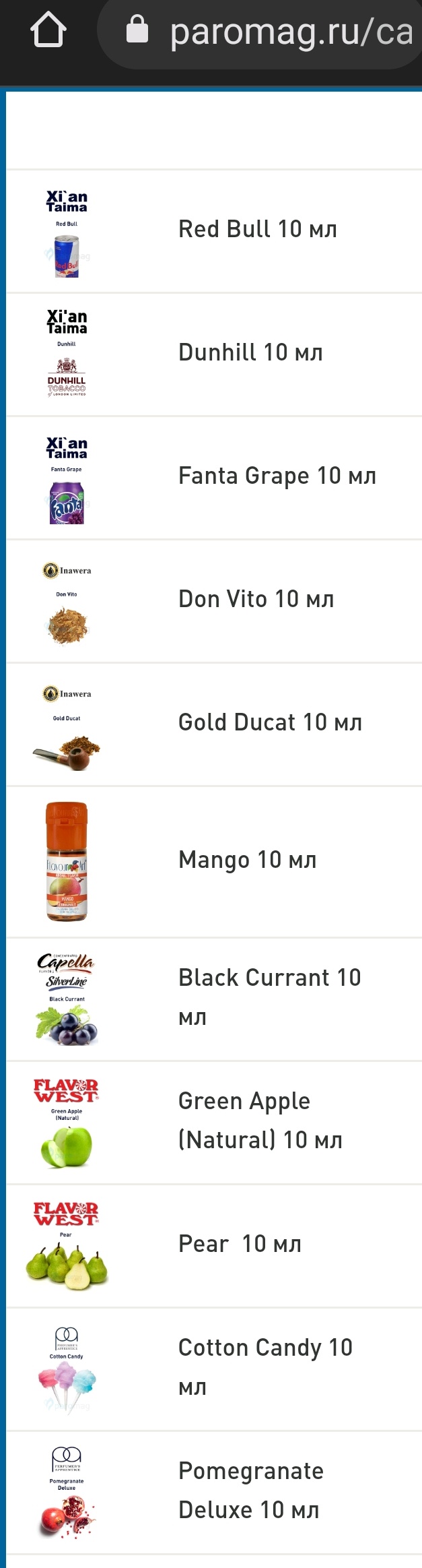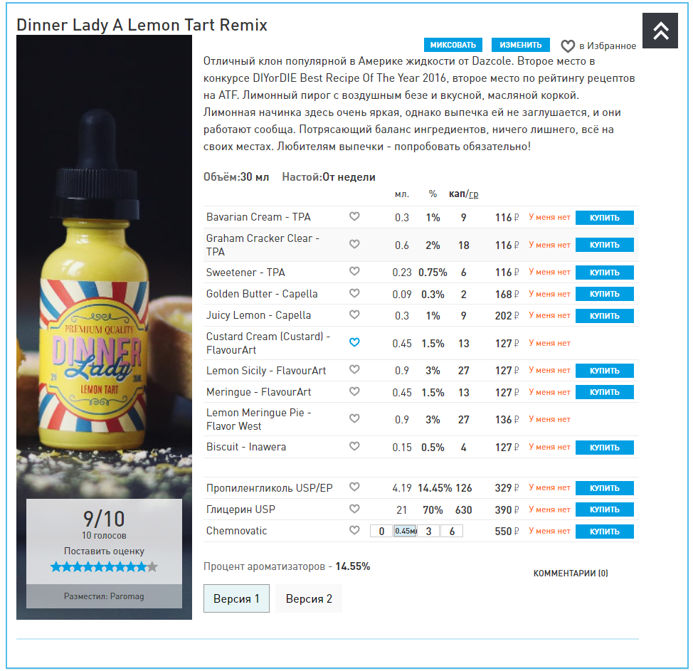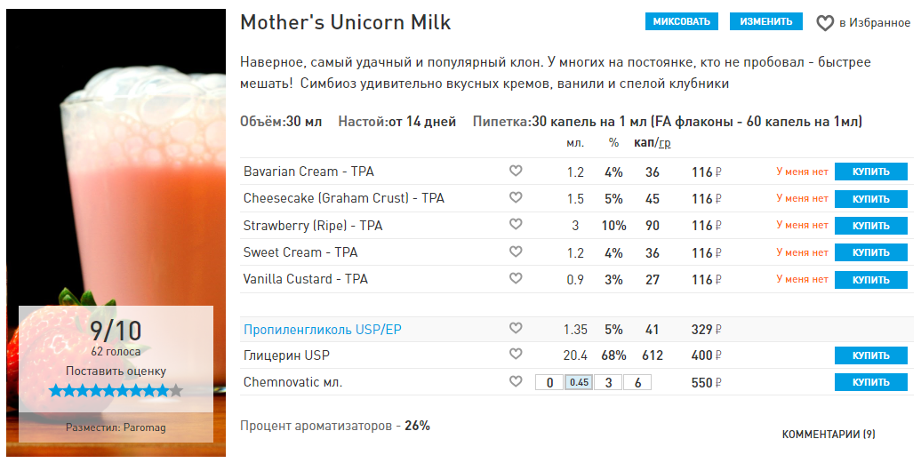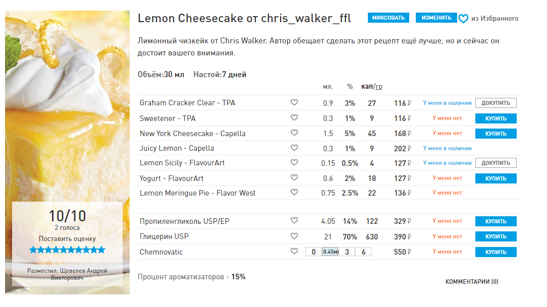 Обновленный список магазов. Чекнул порн - там ассортимент намного меньше, но ПГ/ВГ можно взять 250мл а не 500 как на паромаге. В целом можно докинуть, почему бы и нет. >На e-liquid-recipes.com куда больше рецептов Тоже докиньте тогда в шапку. >черри сигар О да, это потрясающая аромка, но прикол в том что там вишня ой как решает, и сигара не похожа на блевотную дефолтную табачку, а ближе к шоколаду что ли. >Не грейте жижоний Чому, кстати? Аромки начнут окисляться быстрее? >Хуя, порриджи изобрели самозамес заново Да нет, вспоминаем по кускамм, как мешали в 2015-ом, благо есть аноны, которые не выпадали на долгий срок из темы. >>506776 Сяп, в следующем докупе накину.