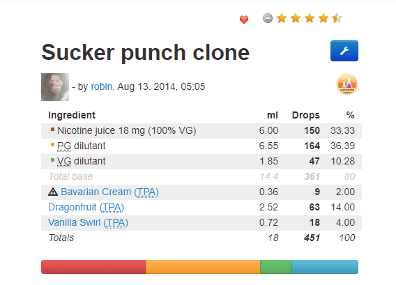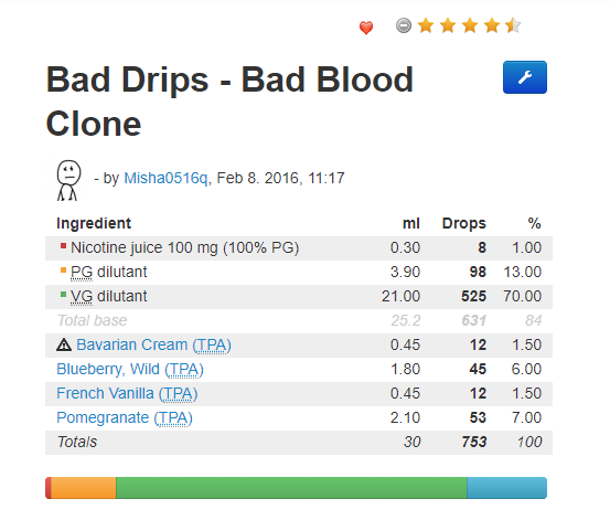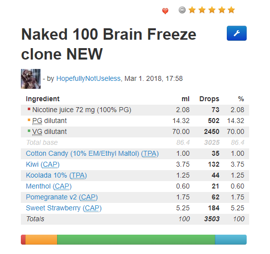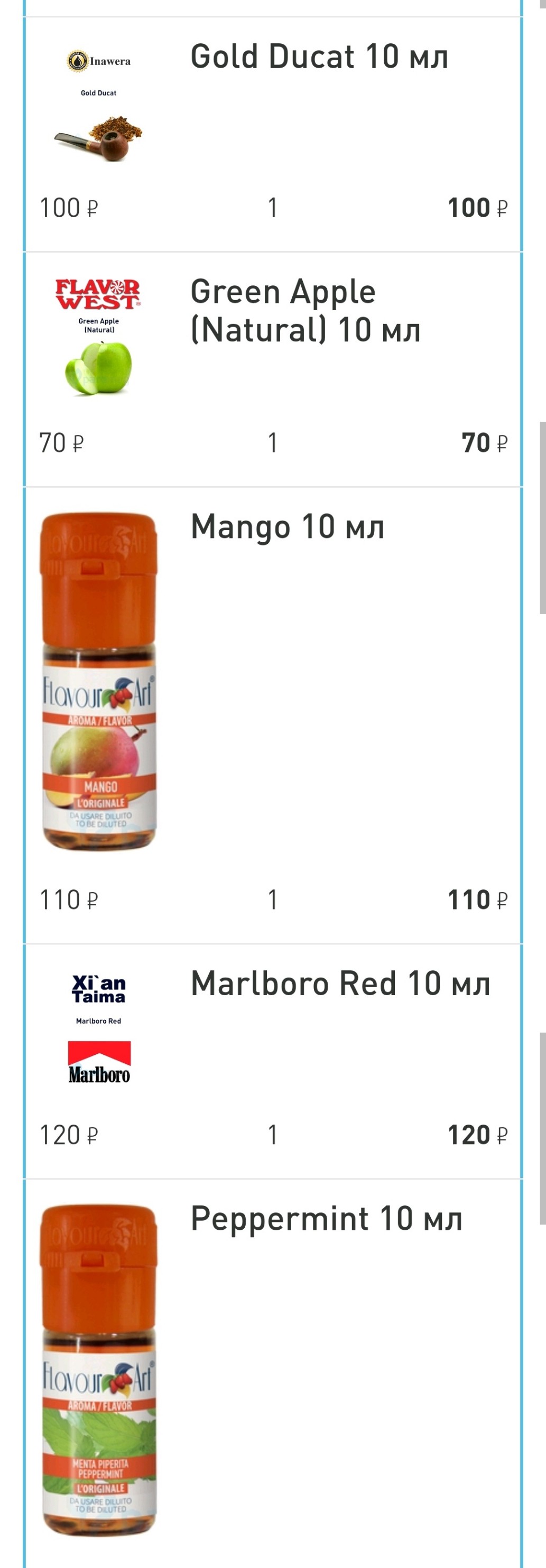 >>518645 Первую лью 7-10капель/мл в зависимости от того сколько аром использую. Со второй аккуратно, советую начинать с 0,5%, мб у меня с рецепторами что-то, но для меня ядреная арома способная забить собой все остальные аромы. >>518754 Сейчас такое себе, скорее всего пососешь бибу по бабкам, но можешь попробовать. Ищешь магаз паромаг, там есть рецепты и аромки для них. Можешь глянуть на e-liquid-recipes com. Ищешь рецепты с концентрацией аром меньше 10% и не больше 2-3 в рецепте, чтобы уж не накосячить. Хотя были люди которым я объснял сколько и чего нужно капать на их тару, а у челов выходила наилютейшая срань, которая не имела ничего общего с тем что должно было получиться.