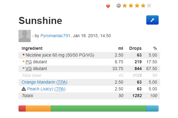 Вкатился к вам, накупил кучу TPA в местном шопе по 50р за штуку, пропилен, глицерин, никотин едет, так что пока что взял базу. Намешал 7 флаконов по рецептам, теперь жду, че из этого получится.