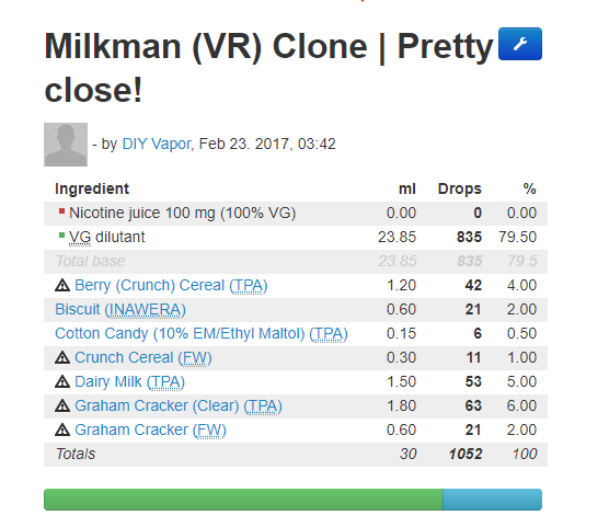 >>506815 Смотри на план действий: 0. Регаешься на e-liquid-recipes.com 1. Клацаешь на май флэвор стеш 2. Добавляешь все свои аромки, нужно писать точное описание, смотри внимательно ту ли арому и от того ли производителя ты выбираешь из выпадающего списка, как правило у всей "попсы" больше всего рецептов напротив названия. 3. Клацаешь на вот кен ай мейк? 4. ????? 5. ПРОФИТ! Думаю уж с пяток рецептов найдётся.