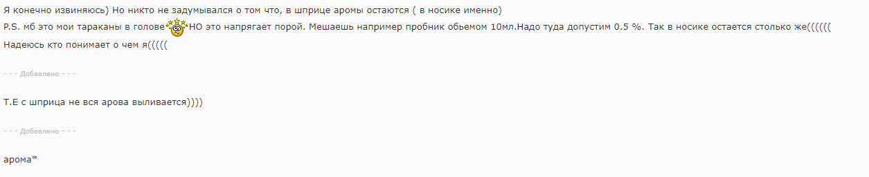 Олд в треде. Парю только самозамесы уже 2-3 года, уходит по 4-5 флаконов 100мл в месяц. ОПу моё увожение за поддержание в живых треда, поправки в оп пост и просто дополнения: 1 - всё это дрочение с порядком заливания компонентов и вращение по кругу по этапам, бесполезное дрочево, заливай как хочешь, в конце хорошо потряси флакон минуту и будет тоже самое. Настой для некоторых аром штука полезная, но вкусный замес будет вкусным сразу, даже если потом раскроется ещё лучше. Если самозамес сразу получился говно на вкус, после настоя он также останется говном. 2 - у ТПА есть много аром где больше 1-2% не надо. Ванилла свёрл, лайм, карамель и тд и тп. Если арома требует 5% и больше для раскрытия, в пизду такую арому, поищите замену у другого производителя с адекватной концентрацией. 3 - магазы для закупа: gosmoke - топовый по цене качество глицерин (литр за 700 в пиздатой таре) и "малазийский" кулер WS-23. Аромы есть и по нормальной цене, но малый ассортимент. Есть оче годные аромы My Flavour malasya. paromag - самый большой ассортимент аром, глиц чуть подороже, нормальный пропиль. Что ещё? Никотин берите хороший, всякие бустеры и нонейм никтотос легко портят целый флакон божественной жижи. Топовые флаконы - это флаконы которые используются, например, под хлоргексидин в аптеках. бесконченое количество использований, не мнутся не трескаются носик легко вынимается и не влыетает. Найдёте где прикупить таких, напишите. раньше брал на samozames ru, но больше там таких нет. По поводу засерания ваты понимаю, почти все покупные жижи страдают этим. Вату засерают подсластители и как сказал оп выпечные тёмные аромы, но, сука, с ними вкусно. При самозамесе вата всё равно умирает медленнее. Решайте сами, на "чистых" аромах вата может жить месяц, проверено. Выпечка и посдластители - неделя. Годные производители аром - FlavourArt (FA), Flavorah (FLV), Lorann Oils (LA), TPA (TFA), Capella. Вкусные жижи получаются благодаря грамотному подбору разных этих аром, одна арома в соло может быть говном, но в миксе отлично раскрываться. В общем, задавайте вопросы, может кому помогу.