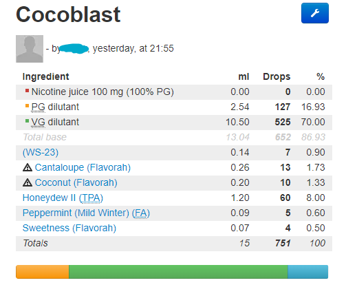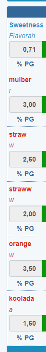 Ну и по первым двум 1) не пробовал ориг, но киви лучше взять от FW, он более сочный и кивийный, FA если нужен более сладкий, нежели кислый киви, и если хочется совсем вкуснятины - кинуть сверху FLV kiwi 0.4-0.6% для вяжущего эффекта самого киви. По стандарту юзануть связку клубничной ягоды Ripe + Sweet strawberry (на самом деле под это дело в зависимости от задачи можно юзать разные клубники, но для создания именно я годы я беру эти). Кокос заменить на FLV или ФА, ФА более молочный. 2) Этот рецепт совсем не зашел из-за химозной дыни, которую лучше заменить на более плотную и менее химозную от FLV