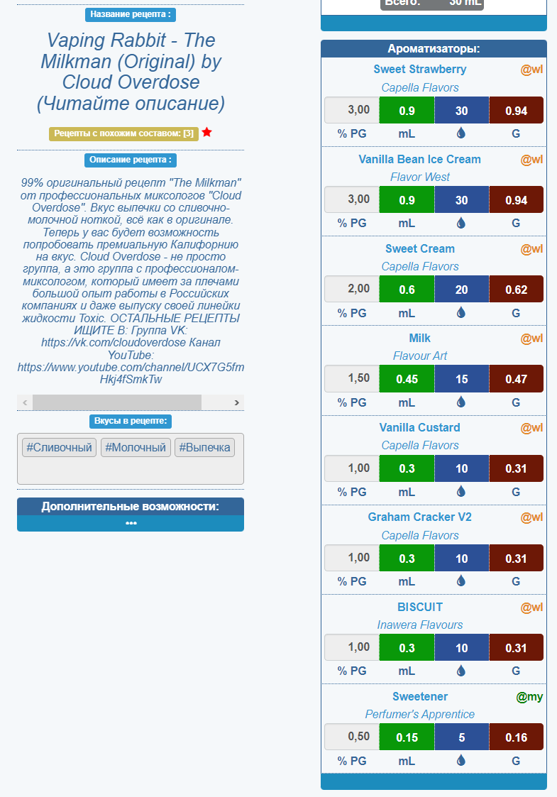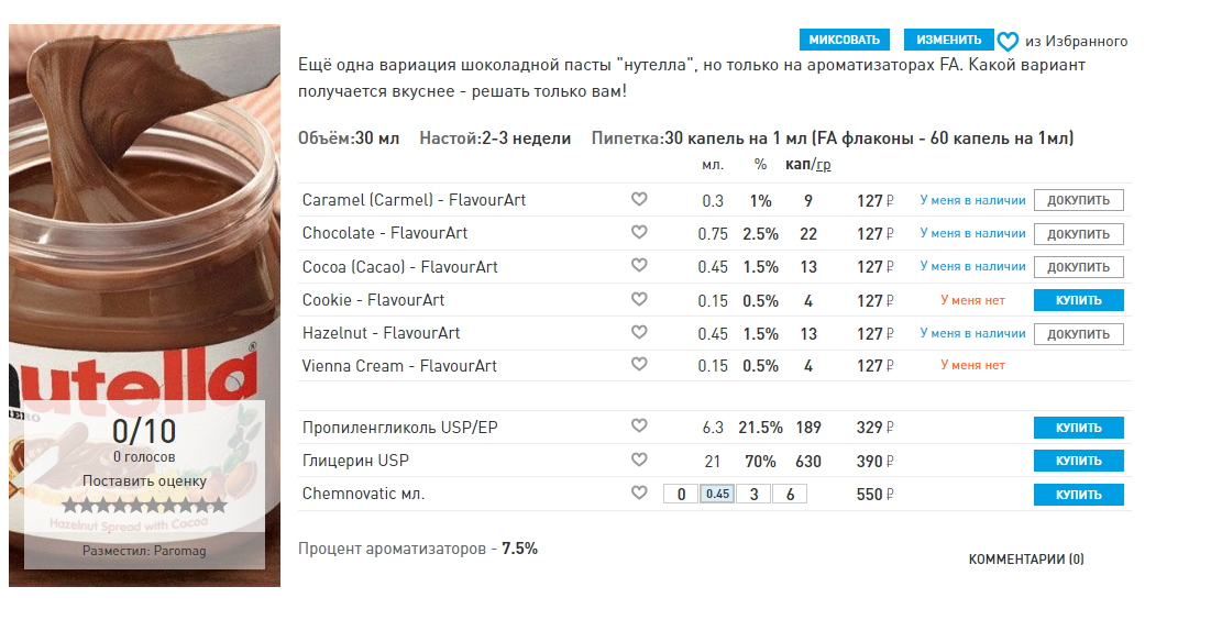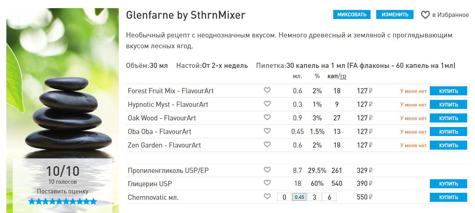 Если хочешь мешать сложные миксы, или найти уже готовые, то обязательно воспользуйся сайтом https://www.vapecraft.org/ в нем есть калькулятор самозамеса, ты можешь добавлять свои ароматизаторы или смотреть оценки на уже добавленные