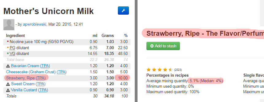 >>518527 А, к юникорн милку лучше подсаживать сверху VBIC и Vanila swirl, а свит крим заменить на крем любого другого производителя для безумцев снизить процент клубники до 5-6 и накинуть сверху свит стровбери капеллы 2-4%хотя как раз безумец придумал лить 10% райпа, который содержит мальтол и отдает зеленью без связки с другими клубниками