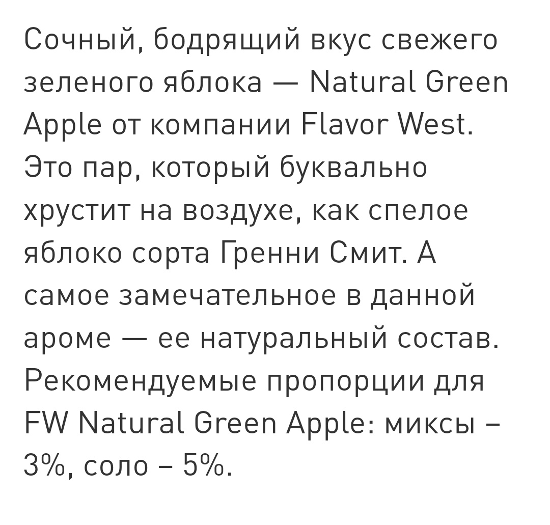 Mexican Cactus 3.5% Я не пробовал кактус, но на переднем плане у аромки свежий вкус чего-то вкусного и необычного, тяжело с чем-то сравнивать, но достаточно вкусно. раньше вроде продавалась газировка с кактусом frushstyle, скорее всего это что-то из той оперы. На фоне чувствуется легкая мякоть цитрусовых без цедровой горечи, вкус едва уловим и служит дополнением композиции. Свежесть достигается без эффекта холодка, кулады здесь нет. Аромка крайне вкусная, опять-таки на несколько голов выше ТПА, но эту бы я бы добавил к какой-нибудь другой, чтоб вкус был еще интереснее. В целом у этих аромок каждый вкус по ощущениям это полная завершенная композиция а не мешанина из отдельных компонентов