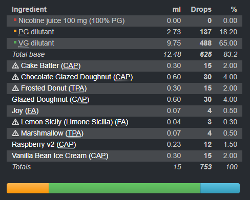 >Составляешь рецепты с кучей аромок в 20% >прикидываешь в голове, как те или иные вкусы будут сочетаться друг с другом >мешаешь 8 банок по 10 мл разных рецептов, чтобы еженедельно корректировать их >решаешь отдохнуть и очистить рецепторы, мешаешь фростед донат тпа 1%, чтоб сгладить вкус ПГ/ВГ