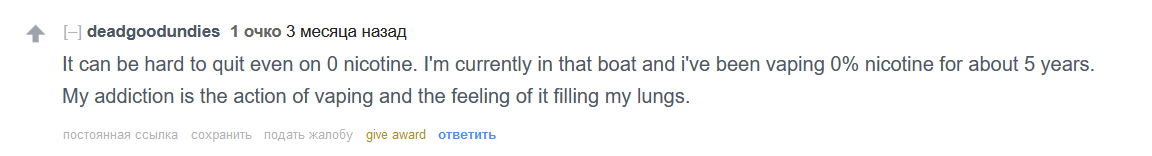 А никотин сам по себе оч слабо аддиктивен, учоные докозале уже. Сиги бросать тяжело из-за связки никотин+ИМАО и самого акта курения, чирканья зажигалкой и вообще что угодно связанное с процессом. Вейп тяжело бросать из-за той же хуйни, это ритуал пускание пара, но уже легче потому что кроме никотина ничего нет, да и ты вот вообще нулевки паришь.