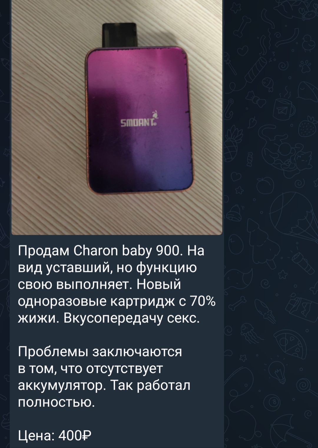 >>518358 вот картриджи мб не подделывают а испарики да. на али испарики можно найти пачку по цене полутора испариков а с кариками такого нет. даже когда в одном шопе работал мне жаловались на паленые S-1 под санти с вб. мол горели за один день буквально. >>518353 Лол ко мне буквально только что подошел чувачок с эльфбаром на 3к тяг, сказал что купил где-то у себя за 400р и вкусно и неделю прожил с подзарядкой. Паль тоже годной бывает по факту иногда.