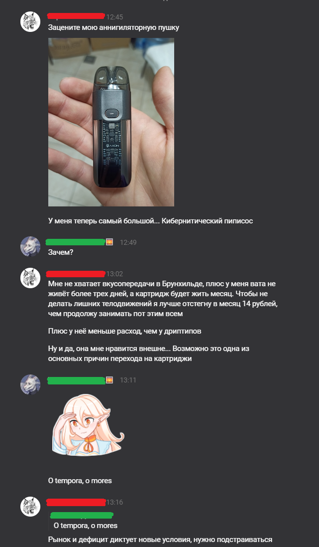 Собственно вопросы: 1) насколько эти киты с испариками хуже нормально замотанного зевса ( по вкусу почти 1 в 1 как таурен дрипка) в плане вкуса и насколько они заебные в обслуживании на самом деле? Может я чего не так понимаю, и там тоже есть своя ебля 2) если зевса поменять на того же таурена, будет ли он так же по блядски гореть при курении раз в час по 10 минут? (5-7 мл шелочной жижи в день) 3) может есть готовый совет про хороший вкус и минимум ебли. Надоело уже протирать жижу, шкрябать по койлам, искать где коротит, угадывать с количеством вату и получать в что-то вкусное только в половине случаев. Особенный провал - когда намотал прям так, что прям кончаешь от вкуса, раскуриваешь дома пол часа, полет отличный. Доливаешь бак, идешь на работу и по дороге ловишь гарика.