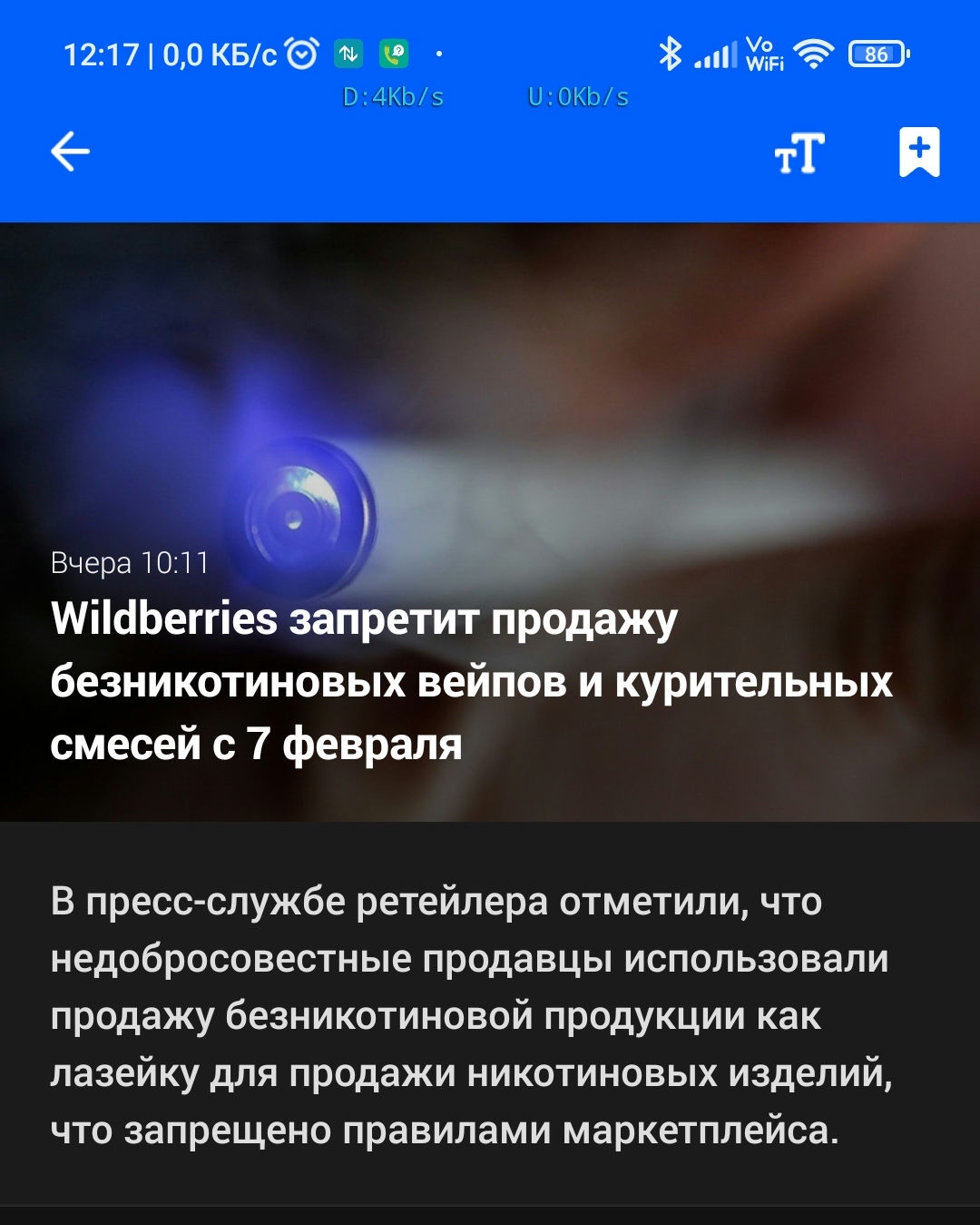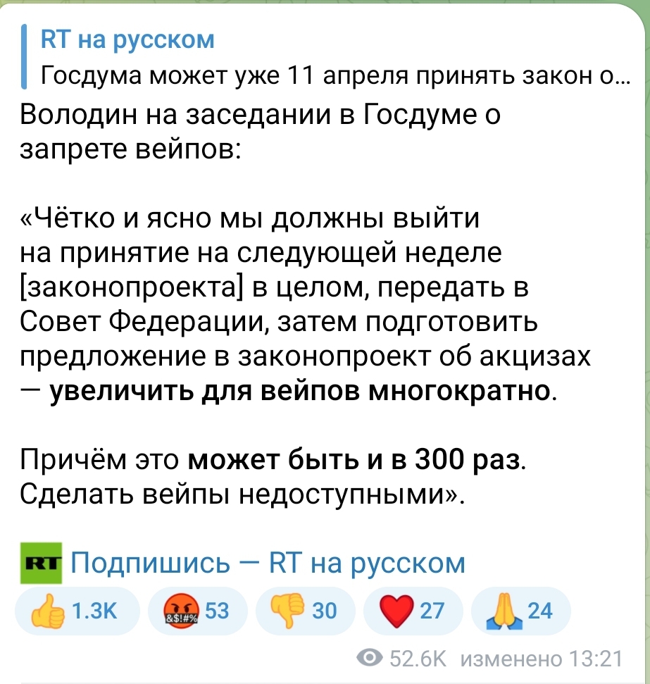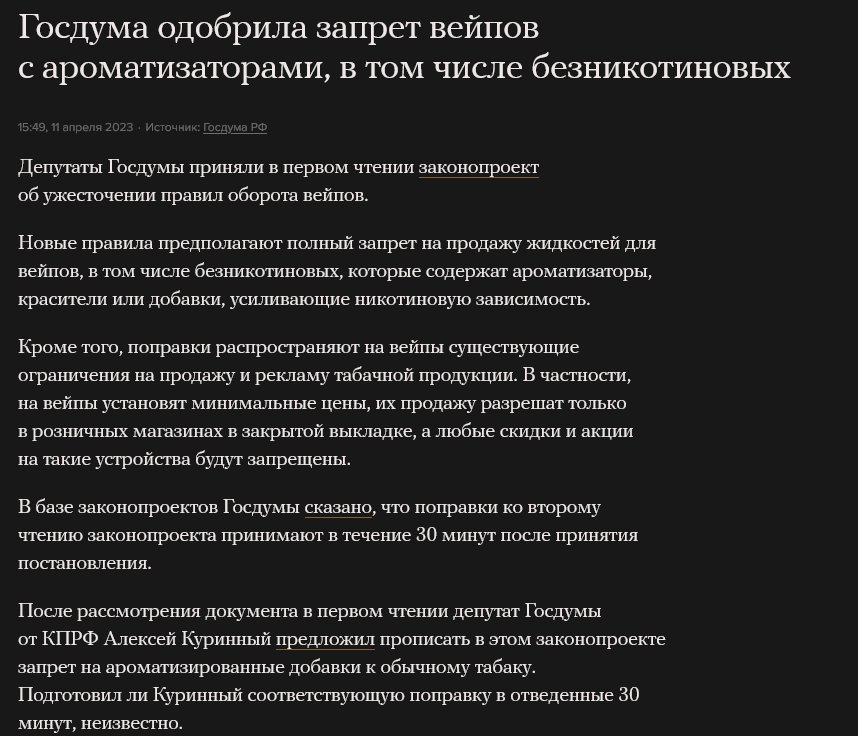 Радует, что от "полного запрета вейпов" долбоёбы перешли просто к "запрету пахучей жижи". Но всё равно пиздец будет. Закуплюсь на полную котлету в понедельник.