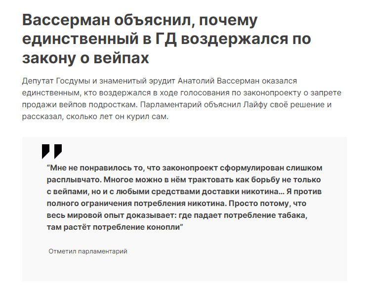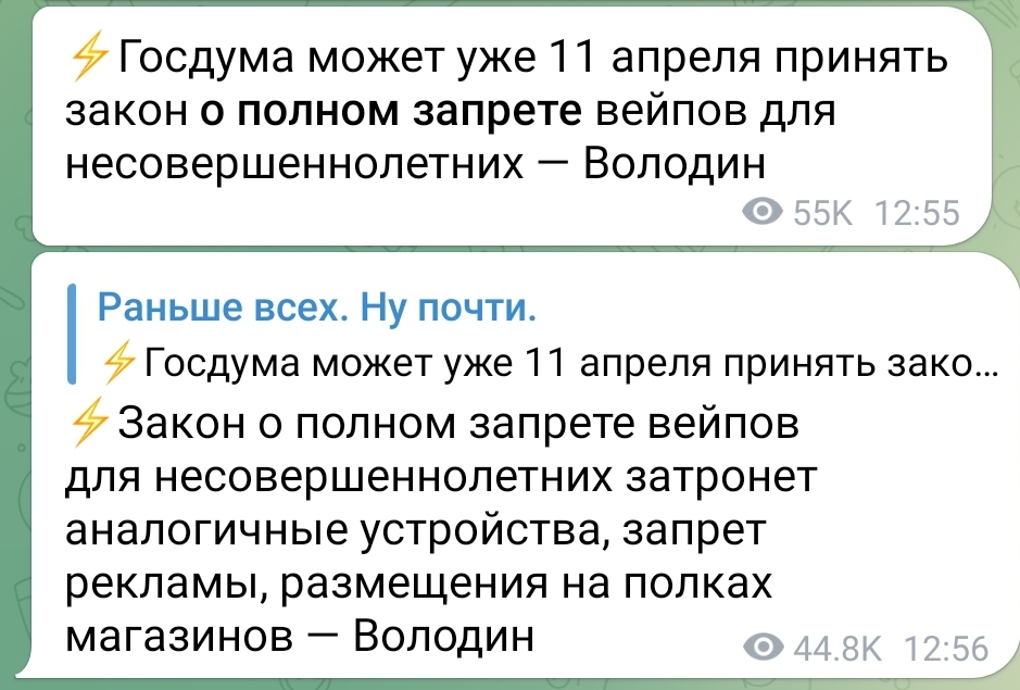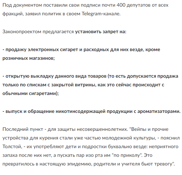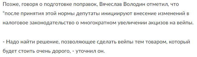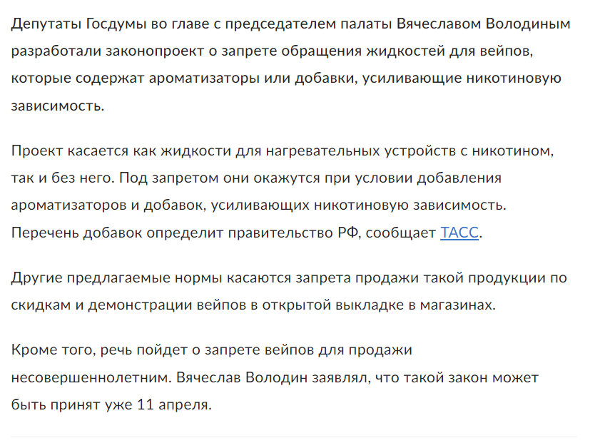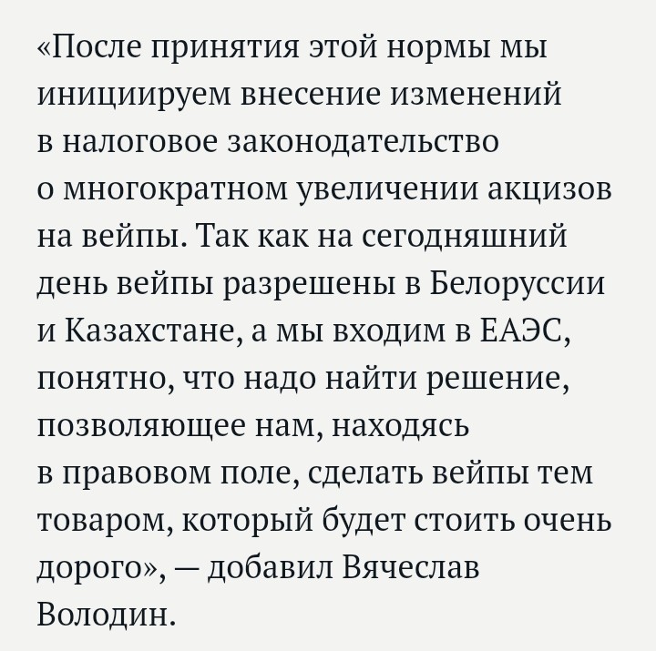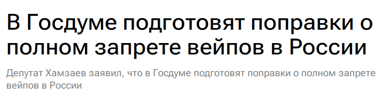 Новостные сайты кликбейтят убирая слова "для несовершеннолетних". Очевидно, они просто хотят заработать бабок с акцизов, а запрещать полностью ничего не собираются. Вот сайт Госдумы где написано, что Володин сказал о желании сделать использование вейпов дорогим. http://duma.gov.ru/news/56789/