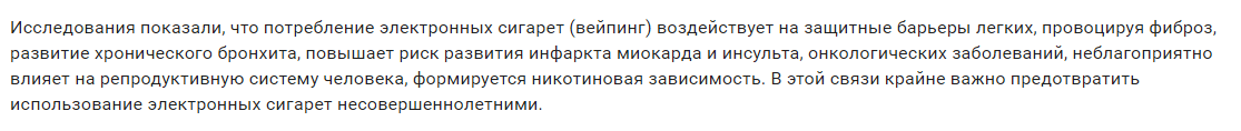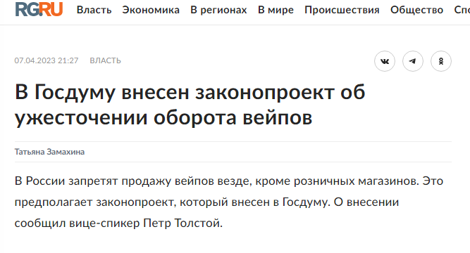 >>534565 ——> >>534561 → >В Госдуме разработали законопроект о полном запрете продажи вейпов в России, сообщает (https://tass.ru/politika/20484149 ) ТАСС. > >Авторы документа приводят данные, согласно которым число подростков, использующих вейпы, на начало прошлого года выросло в 10 раз по сравнению с 2011 годом.
