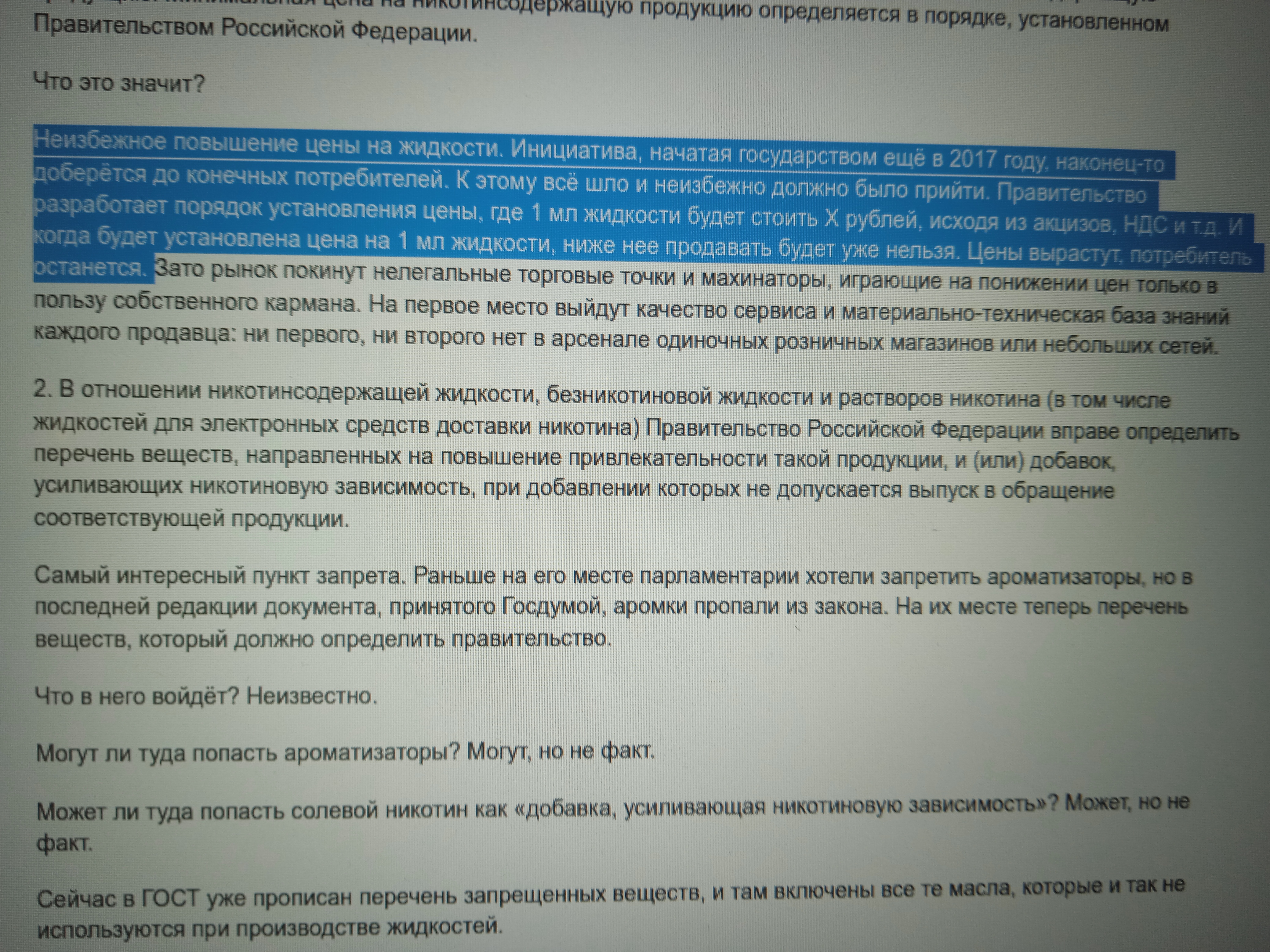 >>525895 Не увидел там, кстати может просто плохо смотрел про повышение цены на базу для замеса. Устанавливается минимальная и максимальная цены для никотиновых жидкостей, и запрещается вкус в жидкостях. Нулевки также должны быть без вкуса, но цена на них, вроде бы не должна быть повышена.