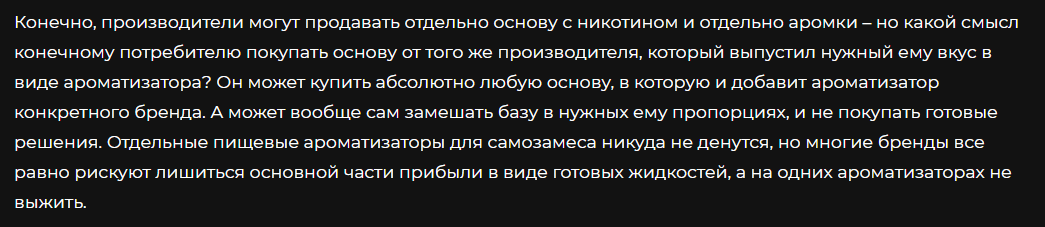 >>526371 >Это вообще не тот товар, что он продает А что его товар? На жиже более чем чем хорошая маржа, это в его интересах в первую очередь, шобы аромки остались в текущем состоянии, иначе ему же придётся основой голой барыжить.