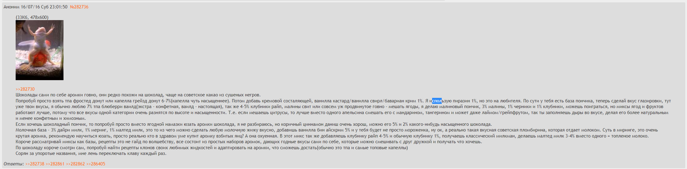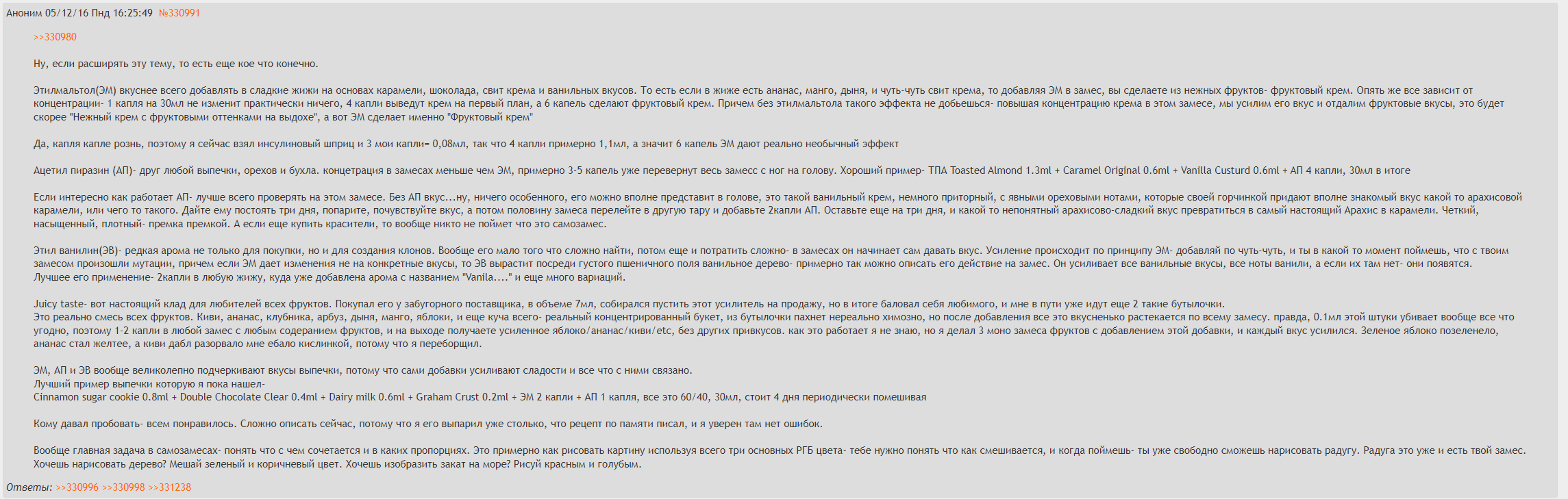 Олд в треде. Парю только самозамесы уже 2-3 года, уходит по 4-5 флаконов 100мл в месяц. ОПу моё увожение за поддержание в живых треда, поправки в оп пост и просто дополнения: 1 - всё это дрочение с порядком заливания компонентов и вращение по кругу по этапам, бесполезное дрочево, заливай как хочешь, в конце хорошо потряси флакон минуту и будет тоже самое. Настой для некоторых аром штука полезная, но вкусный замес будет вкусным сразу, даже если потом раскроется ещё лучше. Если самозамес сразу получился говно на вкус, после настоя он также останется говном. 2 - у ТПА есть много аром где больше 1-2% не надо. Ванилла свёрл, лайм, карамель и тд и тп. Если арома требует 5% и больше для раскрытия, в пизду такую арому, поищите замену у другого производителя с адекватной концентрацией.