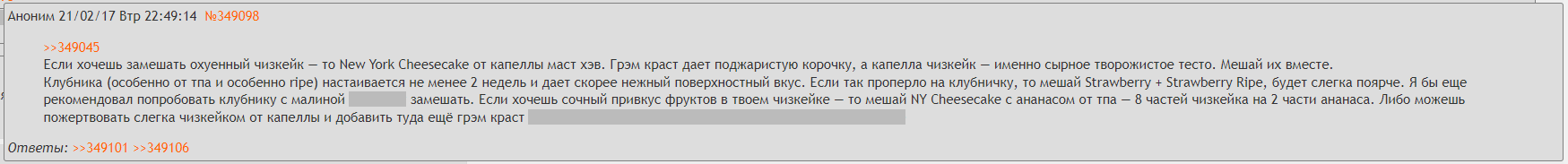 >Capella Sweet Blend Если ты берешь какие-то готовые миксы вкусов, то первым делом воспринимай его как скелет рецепта, на который ты будешь лепить мясо в виде отдельно взятых вкусов из этого микса, но от других производителей или того же, но зачастую в миксах используются аромки из основной линейки бренда, как например в миксах от FA, а потом накидывай поверх этого скелета с мясом кожу в виде незначительных акцентов по своему вкусу или уже устоявшиеся сочетания. >Это смесь малины, клубники и смородины со свежим послевкусием аниса Сразу напрашивается свежесть, а это либо кулер, либо зеленая травянистая мята, плюсом можно докинуть кокоса, с клубникой оч хорошо сочетается, но чистых фруктов у тебя уже много, поэтому я бы добавил кокосовое молоко, а это coconut от FA. Анис, конечн сильно ограничивает в выборе, да и этот микс не накинешь уже на другой скелет по типу платиновых йогуртов или выпечки, но думай в направлении именно допила фруктового микса. Если совсем вдаваться в порнуху, то можешь прибегнуть в конфетизации рецепта, у меня такой набор всего не вспомню, но это прям база: Jelly candy CAP/jelly-jammy candy wizard/27 bears CAP - если хочется уйти в область желейной конфеты, в целом еще у пурилума какие-то джелешки есть, но я таковых не имею. Джeлли кэнди и 27 мишек можно использовать в стаке для взаимодополнения, они имеют небольшой ананасовый привкус, который отлично встанет в твой микс, jelly wizard больше как улучшайзер для микса, который преобразует его в своеобразную желейную конфету, но результат непредсказуем и надо экспериментировать. Если хочется уйти в область именно конфеты, то тут решай какой именно: карамель леденец, сахарная пудровая или драже типа скиттлза. Если карамельный леденец, то на помощь может прийти Red Licorice ТПАно признаюсь, я его еще не юзал, но по ревью это именно стеклянный леденец или Sweet Candy CAP, но он тоже работает как улучшайзер уже готовой смеси аромок и может работать совершенно по-разному отличие аромы от улучшайзера в том, что арома дает именно вкус, всегда одинаковый, на который могут крепиться остальные вкусы. Улучшайзер же влияет непосредственно на те самые вкусы и их восприятие. Думаю, это очевидно, иногда может превратить микс в желешку, но чаще всего похоже именно на карамель. Совсем экзотика - Ice Bon Bon от Liquid Labor, мятная леденцовая конфета, которая охуенно зашла бы в твой премикс, но блять вряд ли у тебя есть такой нишевый ароматизатор. Если хочется пудровую конфету, то ООО powdered sugar, Merengue от FA и Candy roll FLV - твой выбор, хотя такой микс вряд ли залезет в пудровую конфету, а вот какой-нибудь скиттлз, который единственно годный - Rainbow Candy от CAP, в нем как раз есть синий смородиновый вкус. И помимо этого миллионы конфет, до которых у меня пока не дошли ручки, но ты понял в какую сторону смотреть А, ну и напитки сюда охуенно зашли бы, что-нибудь типа лимонада.