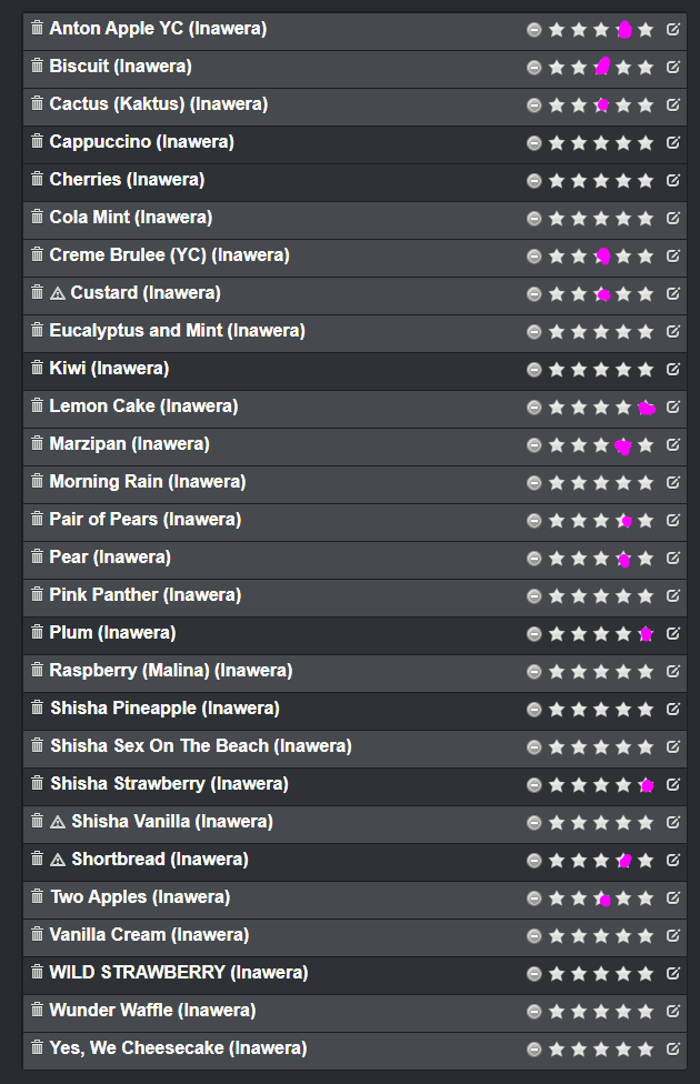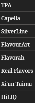 Небольшой рейт по последним закупкам(по 20 аромок) TPA говно, ни одна не нравится, химозно, разбавленно, если и есть попадание во вкус то отстойное, крем де мент как бражка из подвала всё портит, в то время как флаворовский идеально сочетается. FA отлично, все фрукты приятны, неплохие кондитерки, но не очень яркие, кастард премиум понравился. CAP так себе, химозненько, привкусы. Только даниш свирл заинтересовал. XIAN херня, химоза, довольно ядреные по концентрации, но вкусы начинают бесить быстро своей топорностью, хз с чего люди хвалят их манго, по мне одно из худших, вот вотермелон неплох. FLV хорошо, интересные вкусы, но некоторые не совсем попадают, дойтч шоколад понравился. INW норм, есть как полное говно типа шиса эпл или черриз, так и приятные типа розовой пантеры и бисквита.