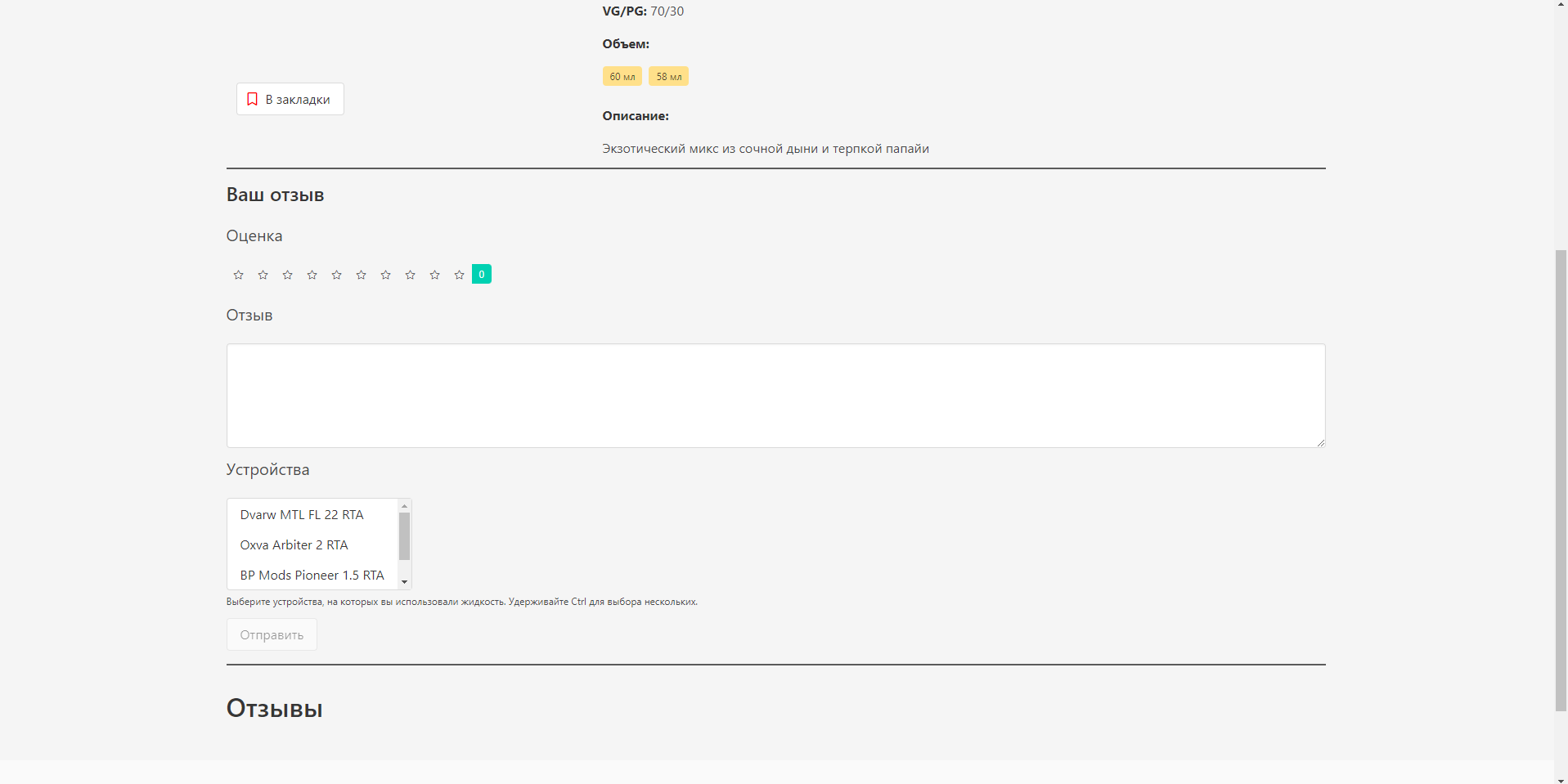 Сайтик сегодня-завтра обновлю. Будет фича короче, чтоб вы могли сразу отзыв писать, даже если жижи нет на сайте, а я уже её добавлю сразу вместе с отзывом.