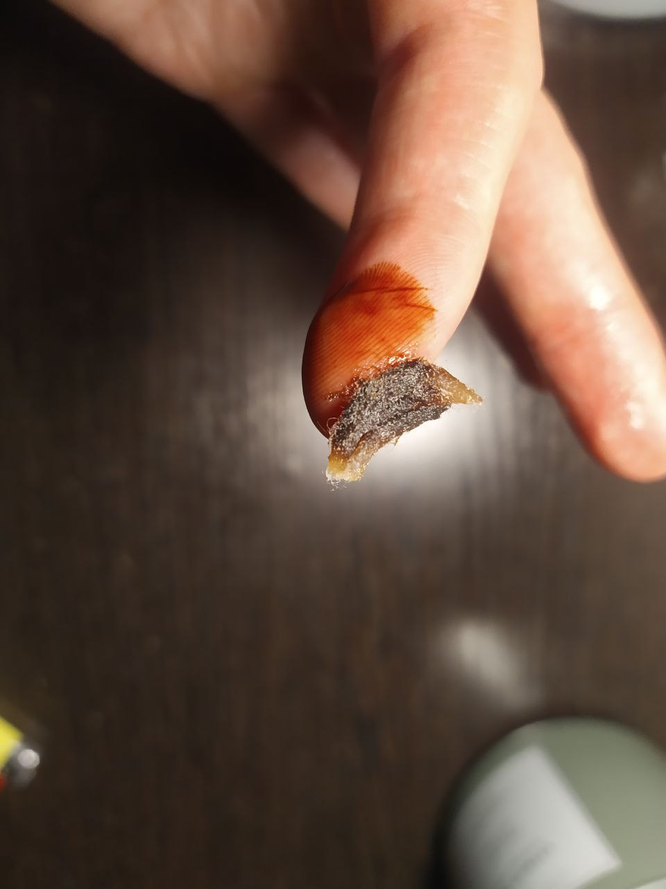 На пике вата спустя сутки парения. Это не сожженная вата, это именно почерневшая жидкость, цвет жижи самой-прозрачный. В следующий раз скину фото койла с ватой.