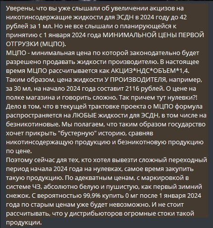 10мл по 550 сейчас, это ещё не по новым акцизам, сказали что 10мл с первого января будут продавать по 880р, на хую я вертел покупать баночку в 30мл за 2.5 тысячи. Как будет дальше, как производители будут изъебываться, - я хуй знает, дай бог чтобы извернулись.