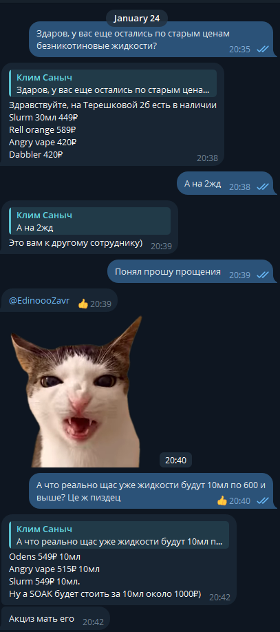 Зашел в магаз и охуел, монстрвапор, энгривейп, скала и прочая залупа что раньше по 350 рублей продавалась за 30 мл, теперь 490 за 10. Просто ахуй блядь, спасибо дядя вова. И чё терь делать? Реквестирую какие нибудь тг группы или подобное где можно закупиться самодельными норм жижами.