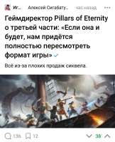 «Я уверен, что некоторые люди, читающие это, считают, что знают причину, по которой Deadfire продалась хуже Pillars 1. У меня такой убеждённости нет, и это одна из нескольких причин, по которым я не горю желанием браться за продолжение. Я не смог дать аудитории Obsidian игру, которую они хотели, и без понимания того, в чём заключались мои ошибки, я могу лишь гадать о том, каковы были проблемы и как их решить».А всего-то надо было сделать романс с Эдером...