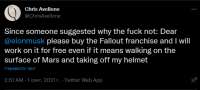 Как думаете, если бы бы анонсировали что Obsidian делает New Vegas 2(ну или вообще любой фоллаут), а сценаристом выступит Авелон, интернет бы сильно взорвался? Ну то есть скорее всего да, но больше интересно как бы потом это конвертировалось в продажи. Если смотреть с позиции MS, у игроков в целом вообще есть на это запрос или это просто из пузыря любителей fallout кажется что это было бы чем то восхитительным? Нужна ли эта игра игрокам? Сработает ли такой хайп как релкама?