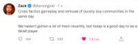 Мы надеемся, что эти изменения на деле смогут даже укрепить идентичность фракций, позволив большему числу игроков выбрать ту сторону, чьи ценности, эстетика и персонажи им нравятся больше, вместо того чтобы выбирать между своими предпочтениями и возможностью играть с друзьями.