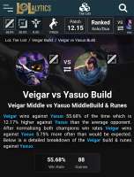 >>43952506 >>43952525 Сайты говна, заходите на лоланалитикс и смотрите на матчап отпшеров. Если ясуо отп то он ебет дефолтного вейгара очень бодро, если вейгар отп, то даже там всего 55% против дефолтного ясуо.