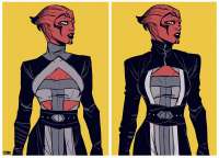 >У большинства азари кожа однотонная, однако на лице, шее и гребне могут присутствовать небольшие пятна и полоски более темного цвета. Также для многих азари, характерны своеобразные рисунки на лице. 2.Лиаре и Бенезии достались "брови". Или это просто макияж, татухи.