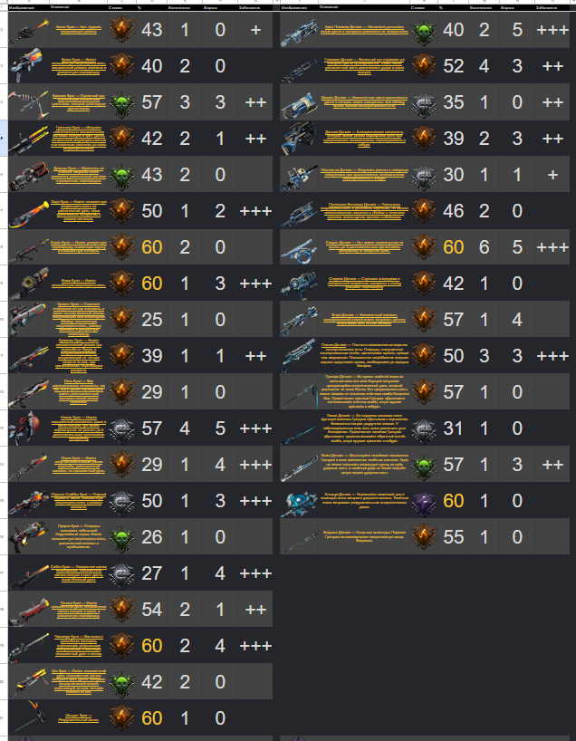 В каком то апдейте бустанули оружки стражей я даже не заметил, сравнивал ру вики и англ. Ру вики устаревшее, англ вики обновленные статы. Вулклок дпс в сек 26,25, рстался таким же Пулемет прайм 71 до, 200! после Верглас пруым 384 остался таким же Винтовка пруйм 275 остался таким же Пистолет пруйм 187,5 такой же Чистильщик 60 до , 270! После, апнули крит кш на 5% и ку на +0.25х Вулкакс 35 до 125! После Артакс 5, бллять 5 урона в секунду! Мультрон 16,83 до, 75 после апнули шк с 12 до 15, ку с 1.8х до 2х, статус с 5 до 22%, неплохо Тазикор 60 такой же Хэлструм взрыв апнули с 5 до 30 но понизили скорострельность с 0.9 до 0.25, дпс с 4.5 до 7.5 поднялся ну ахуеть спасибо папаша за такой урон Жало такой же 49.95 Криотра с 10 с 20,1 апнули кш с 5 до 10, статус урезали с 35 до 10