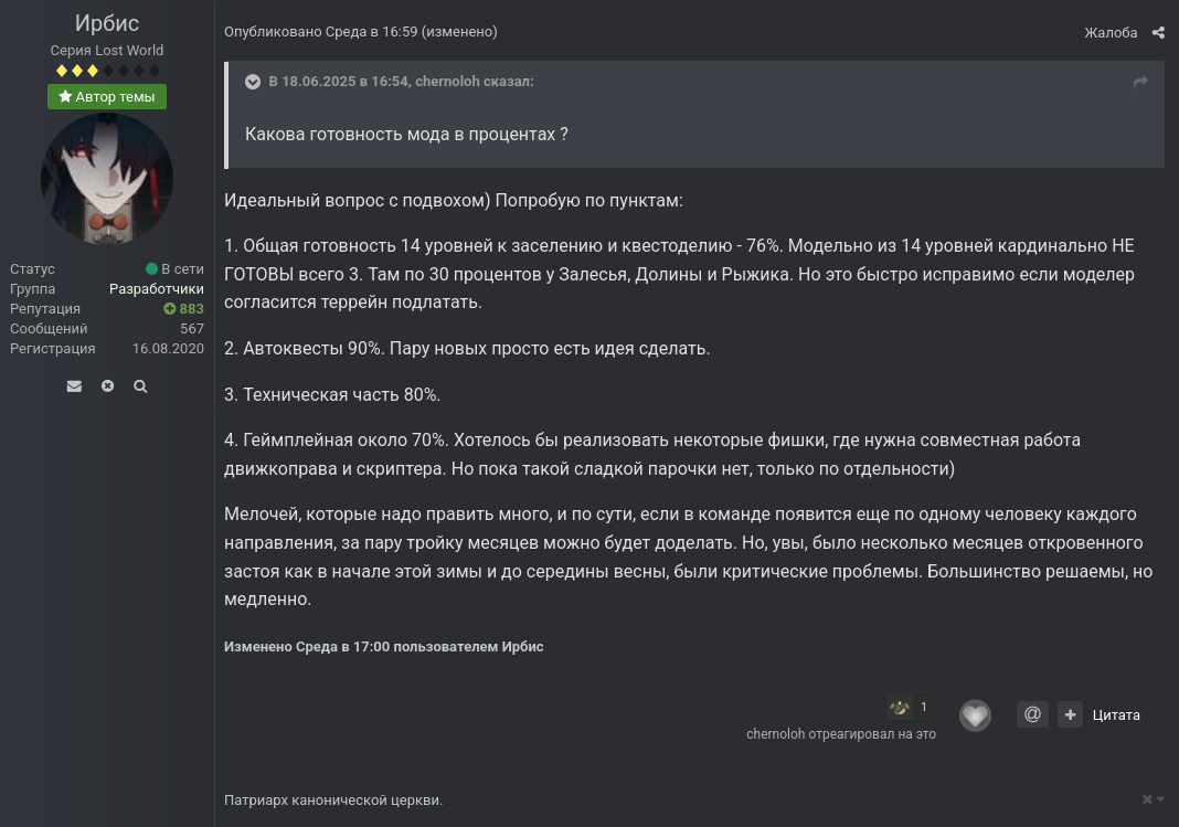 Походу хуй забил после патча 3.0. Разраб проебал редкую текстуру для мерка, из-за этого у меня при переходе на на дикую территорию всё время краш был. Взял из файлов аналогичную текстуру, переименовал как недостающую и всё стало нормально. Чуть постабильнее чем гамма, модов всего 188 в сборке. Новых квестов нема, ну я по крайней мере не заметил.