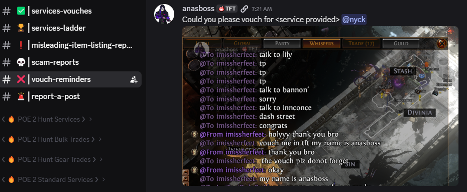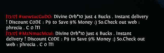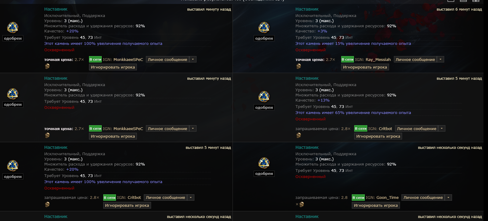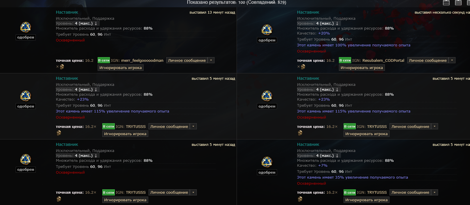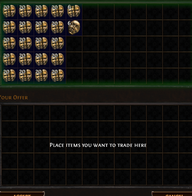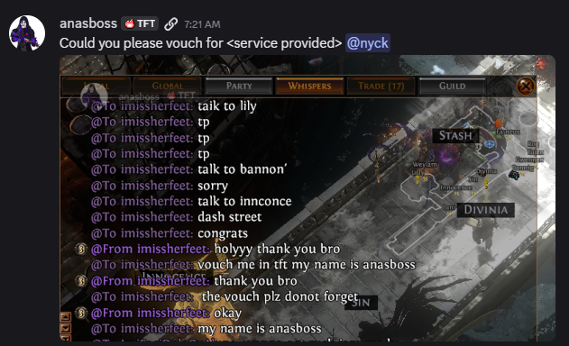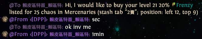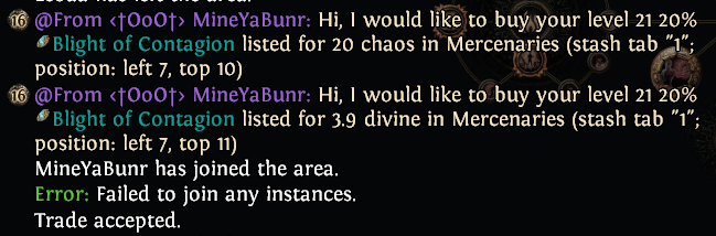 у меня сча чел с 2 ачивк покупает и цена стоит 40див а он сует 40 хаосов ну я вместо дефолт игнора говорю ты че рофлишь цена 40д он такой извини дай мне пожалуйста 5 минут НЕ ПРОДАВАЙ приглашает в пати китайца че то они делают китаец ливает и он мне платит 40д орунаху