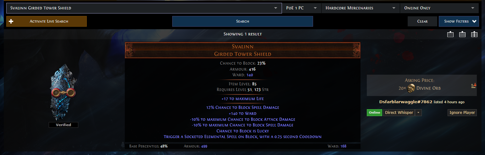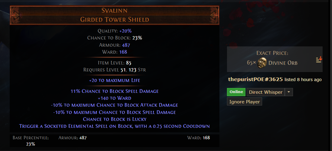 Хотел себе вкусняшку купить, а она 30 хаосов стоит(( Где столько на 50 уровне взять... А Svalinn Girded Tower Shield вообще 20 диванов стоит, придётся без него играть...